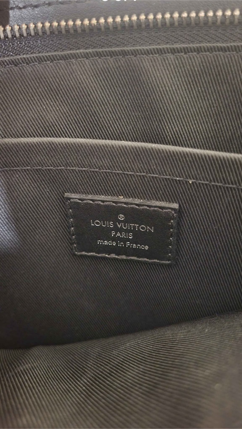 Authentic Louis Vuitton Pochette. Damier Graphite canvas. Black leather trim. Zip closure. Interior pockets. Includes dust bag and box. Made in France.