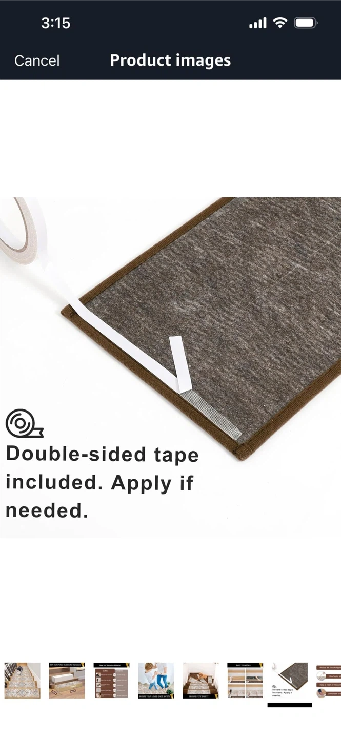 These HEBE new stair treads are designed for wooden stairs and feature a self-adhesive backing for easy installation. They're made with durable material and a non-slip surface. This set includes 15 individual stair treads, each measuring 8"x30".