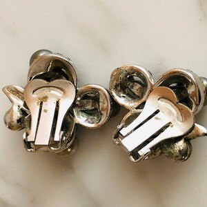 Signed Boucher Vintage Clip On Earrings Rhinestones and Pearls, signed Boucher on the back of one earring and the patent number on the back of the other. Clips are perfect except for one missing rhinestone - pearls are perfect, also one single rhinestone appears a little darker than the rest, nothing major but worth mentioning.
