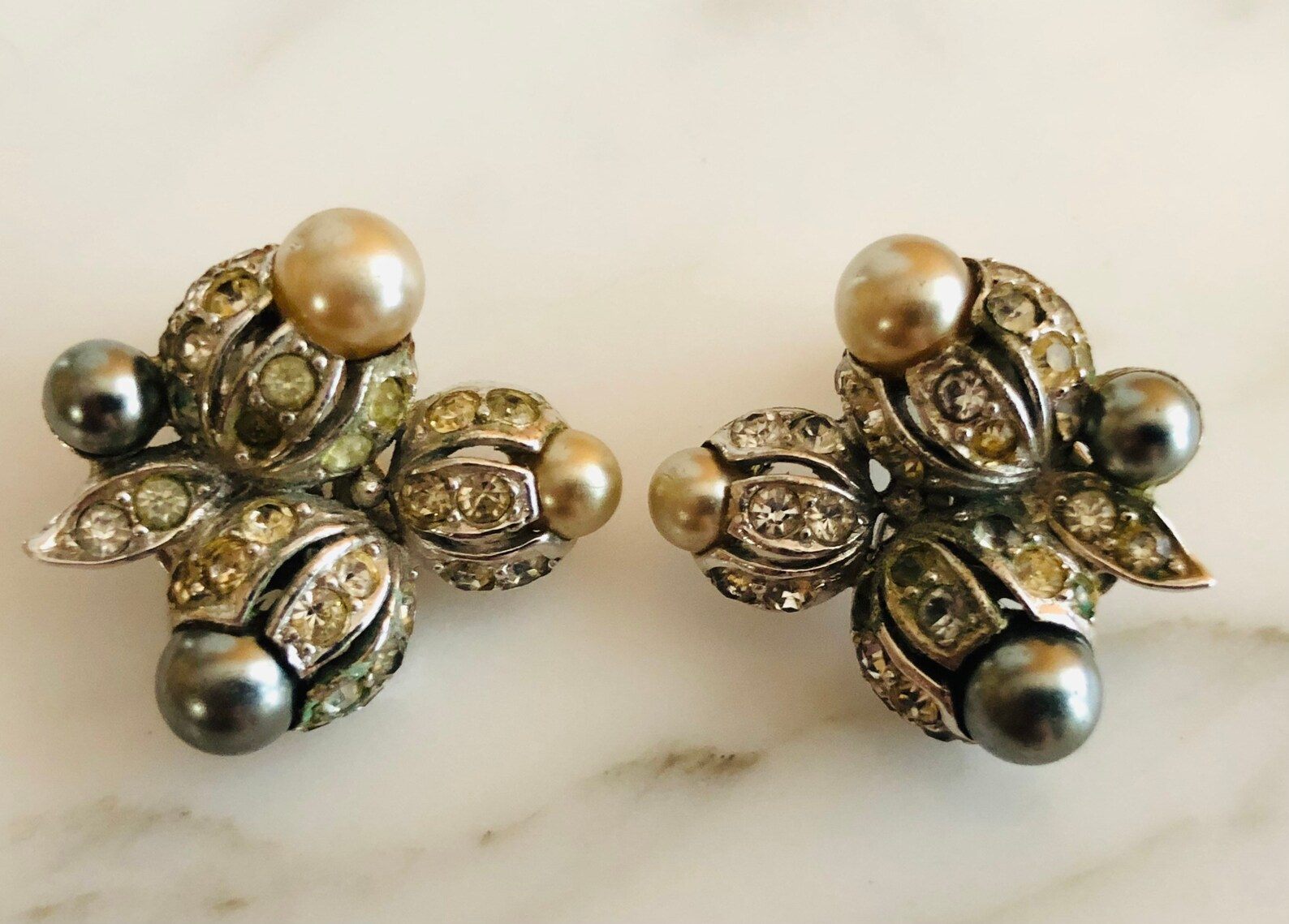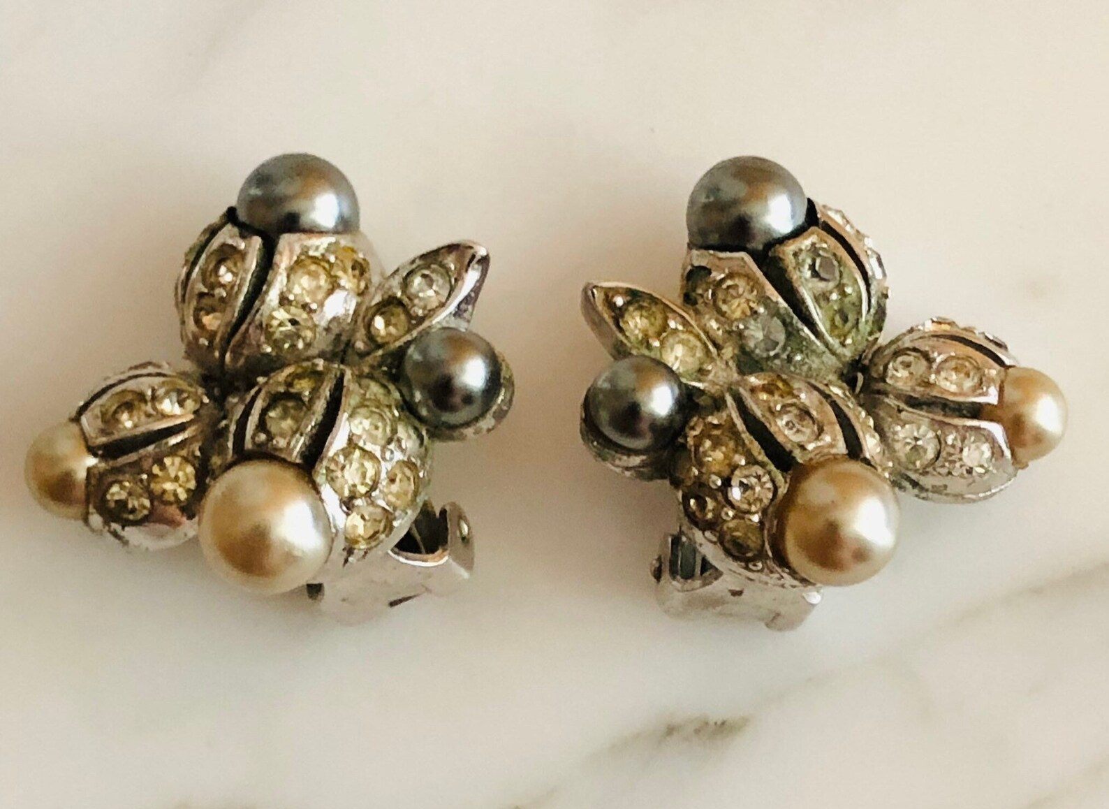 - Materials: silver tone, faux pearls, rhinestones
