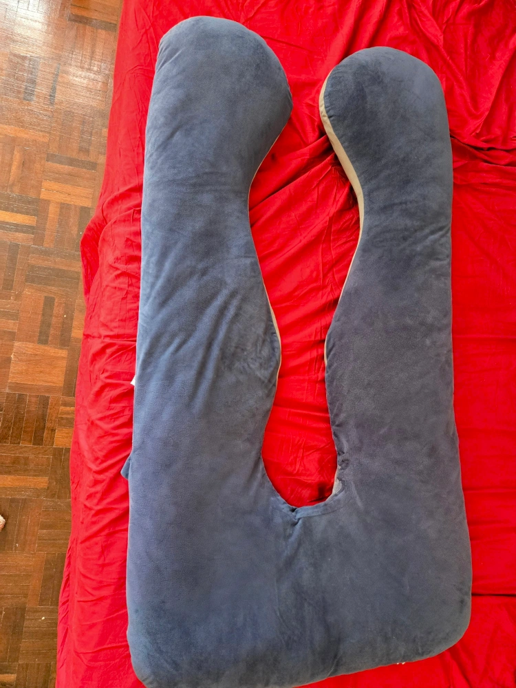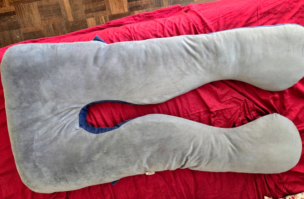This is a U-shaped pregnancy pillow in grey. It provides full body support for a comfortable sleep during pregnancy. It's in great condition!