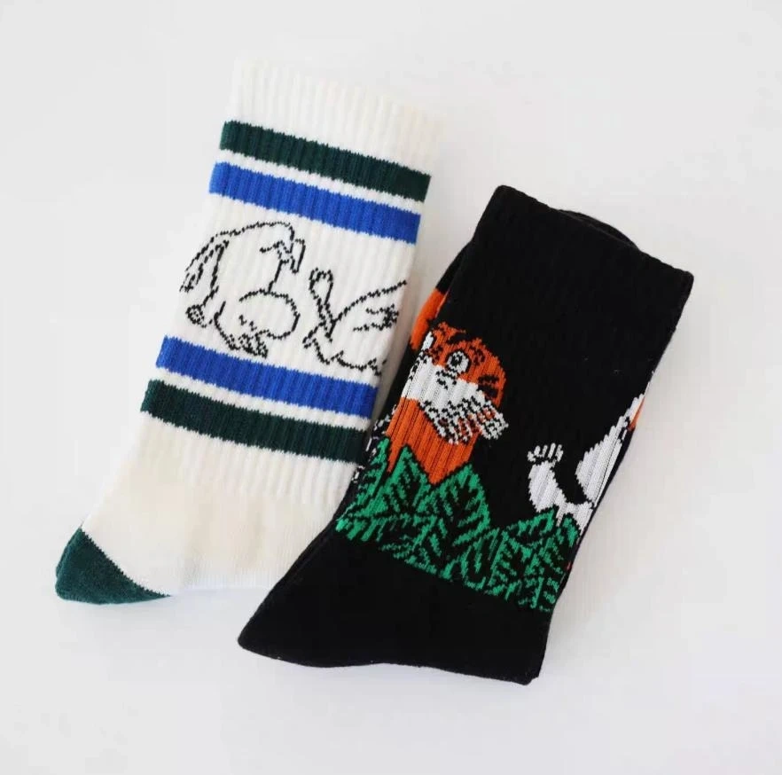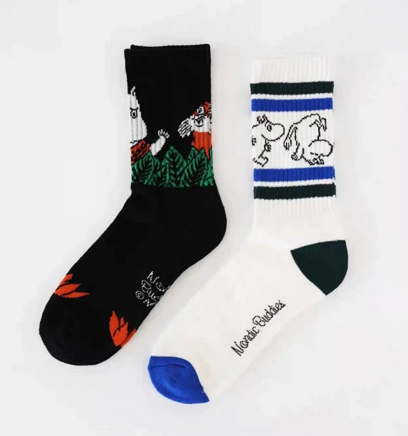 These Nordic Buddies crew socks feature fun Moomin characters. One pair is black with white and orange Moomin characters, and the other pair is white with blue and green stripes and Moomin characters. Comfortable cotton blend material.