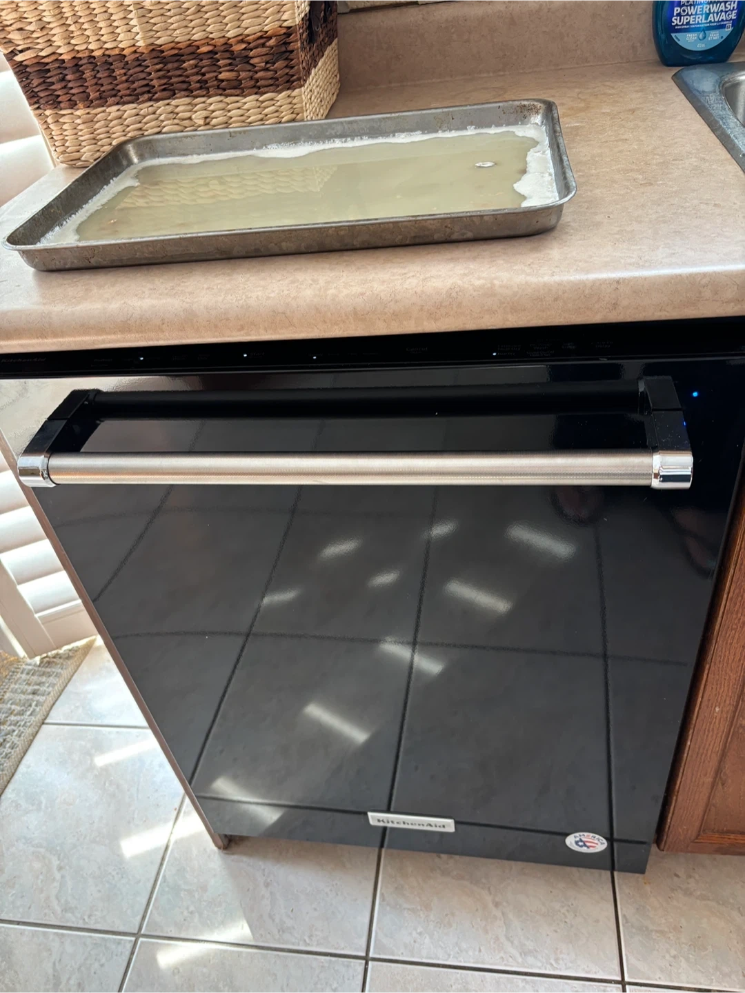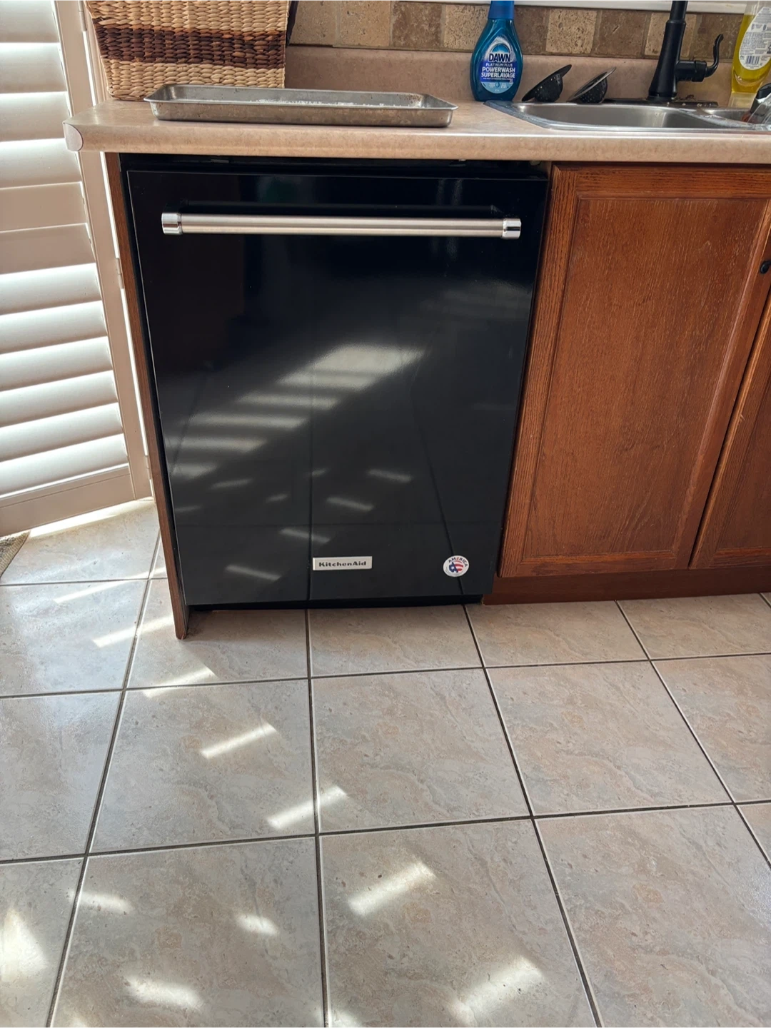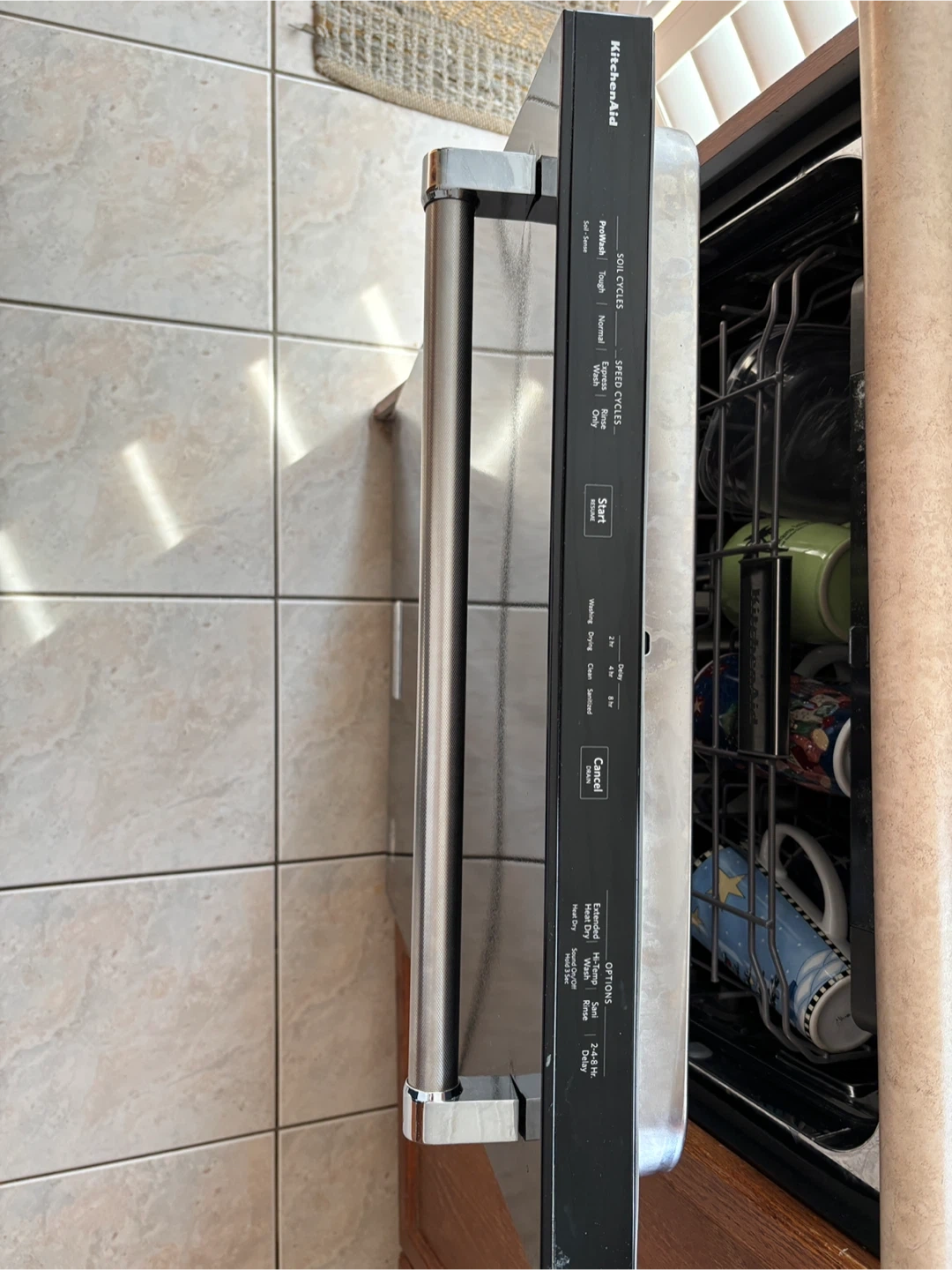 This is a black Tall KitchenAid dishwasher. It features multiple wash cycles including Normal, Heavy Duty, and Express Wash. Stainless steel interior.