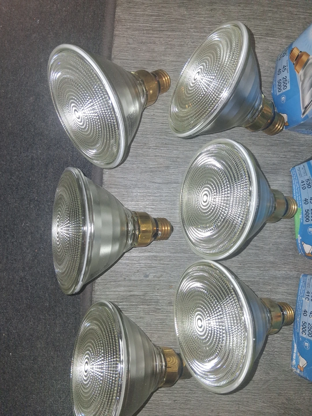Selling six Philips 45W flood halogen PAR lamps. These bulbs offer 2500 hours of light and are 130-volt. They provide a bright, focused beam for various lighting needs. Suitable for accent lighting or task lighting applications.