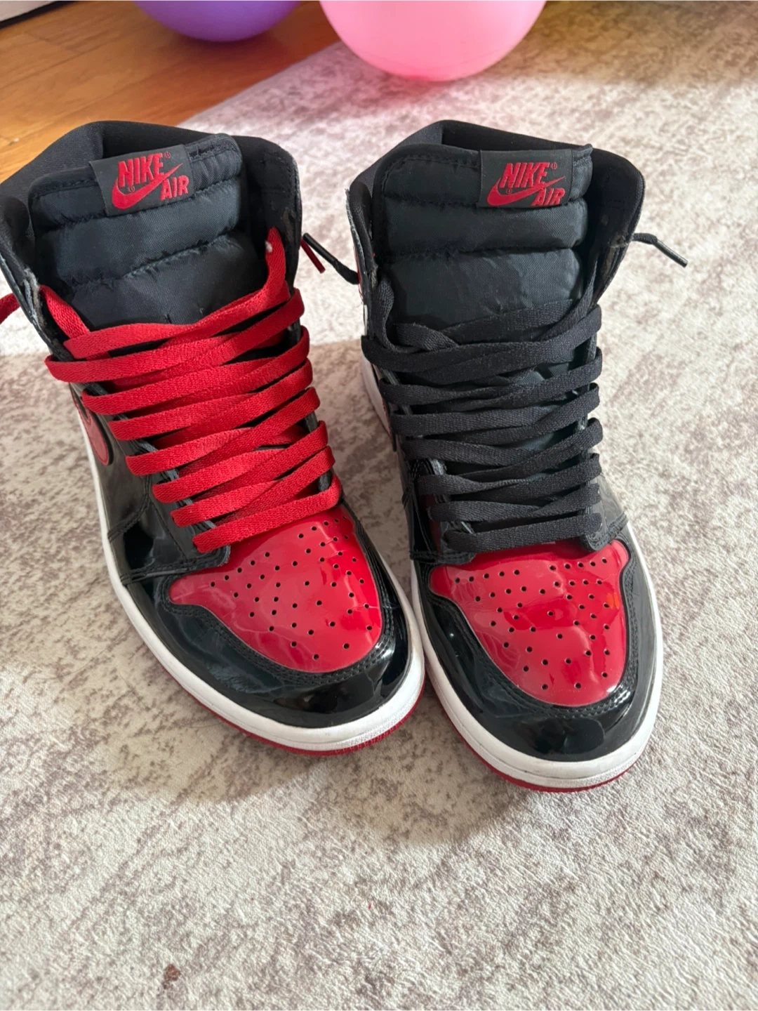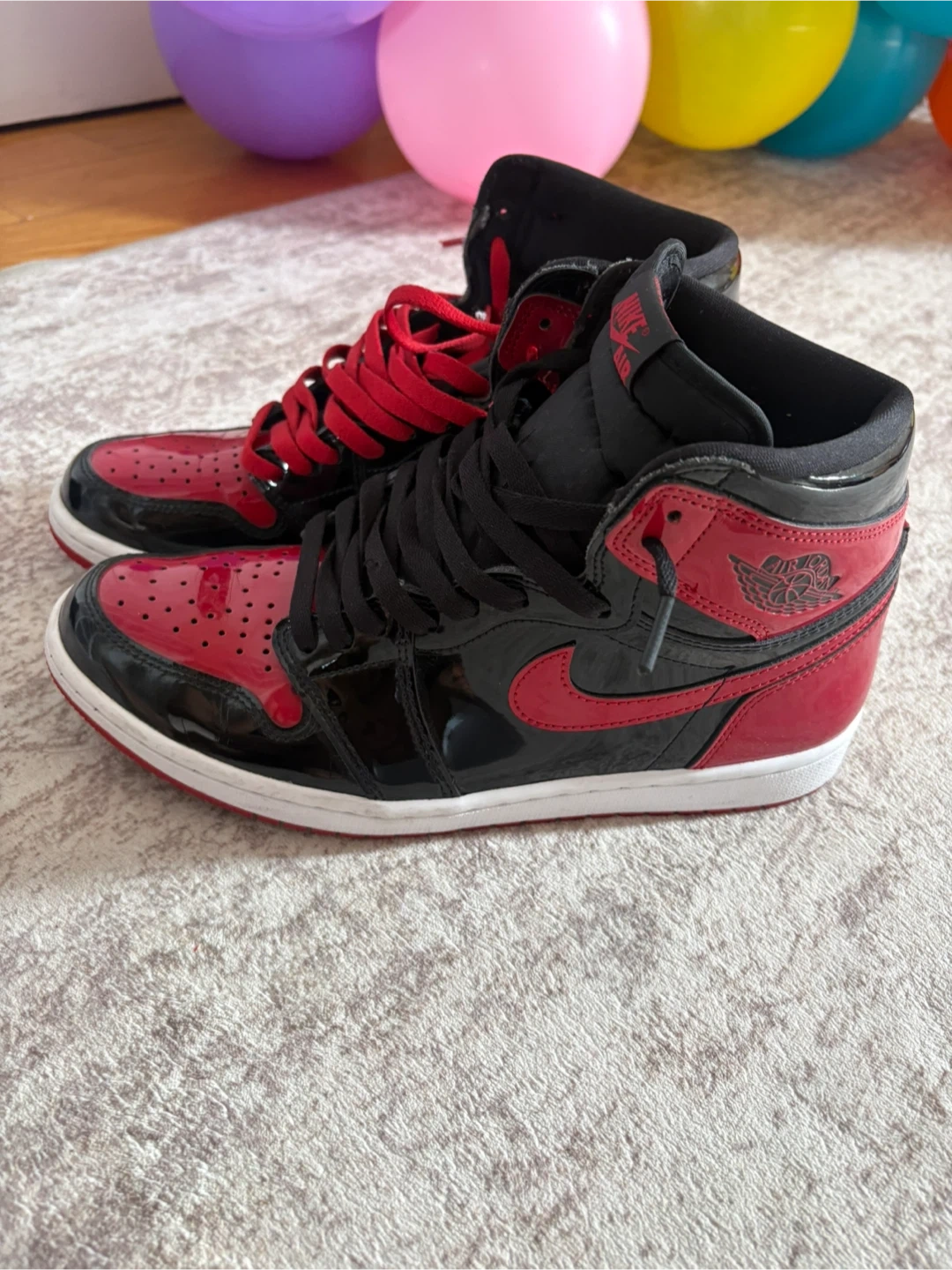These Air Jordan 1 High OG sneakers feature a glossy black and red patent leather upper. The iconic Nike Air branding is visible on the tongue. Includes both black and red laces.
