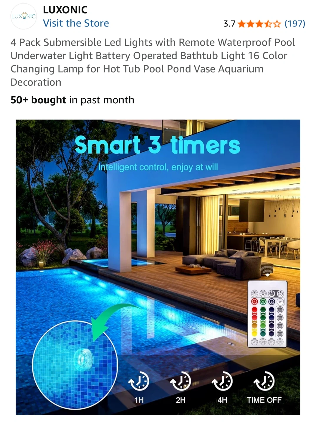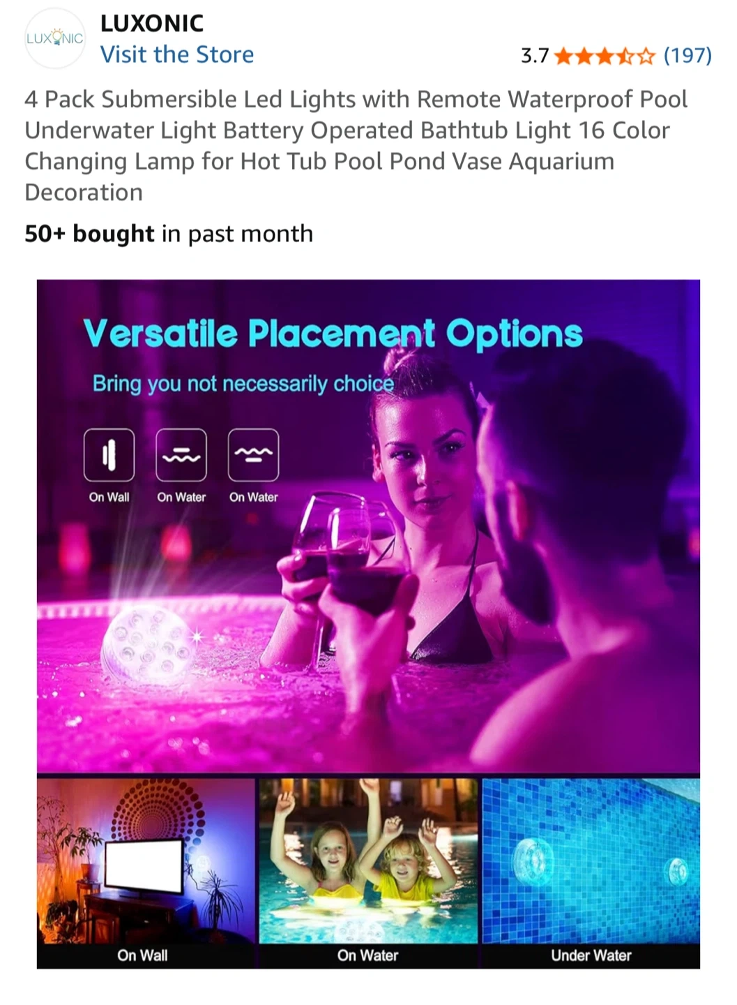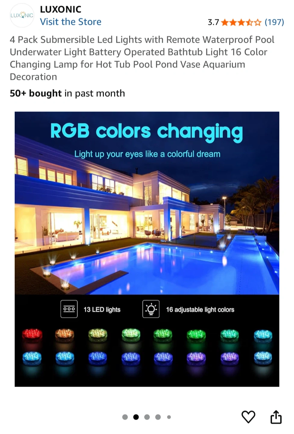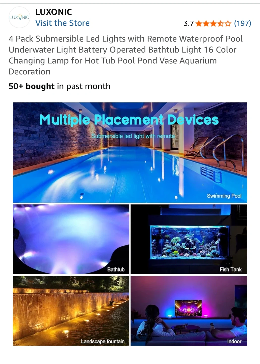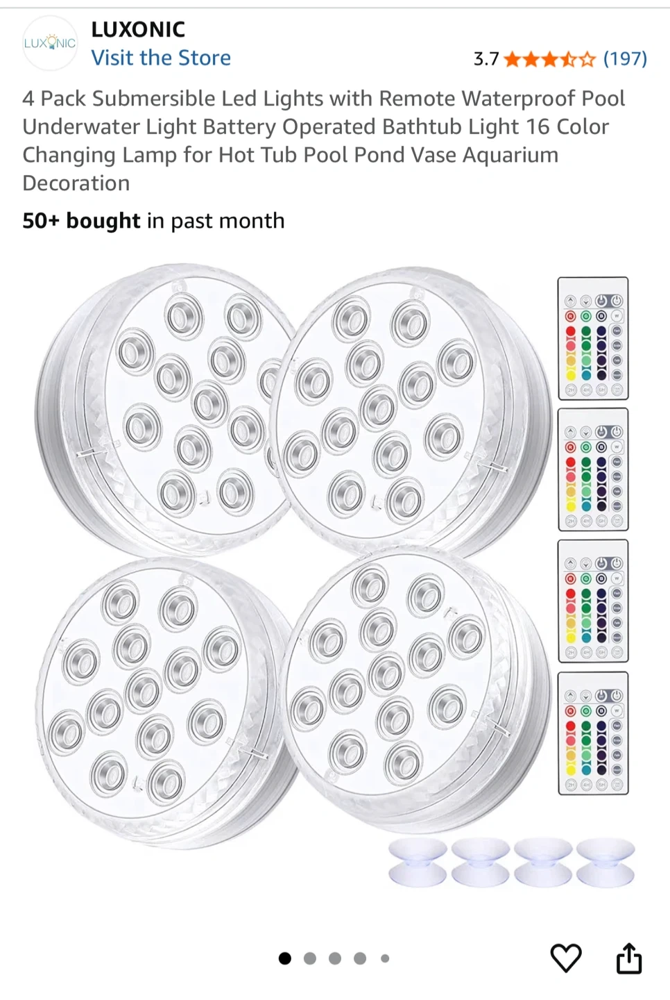Selling a set of 4 LUXONIC submersible LED lights. These lights come with a remote and are waterproof, making them perfect for pools, hot tubs, ponds, vases, or even aquariums! They feature 16 adjustable light colors and smart timers for intelligent control