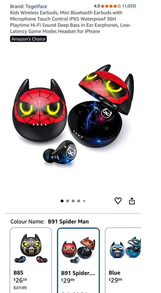 New Kids Spiderman Wireless Earbuds, Mini Bluetooth Earbuds with Microphone Touch Control IPX5 Waterproof 36H Playtime Hi-Fi Sound Deep Bass in Ear Earphones, Low-Latency Game Modes Headset for iPhone