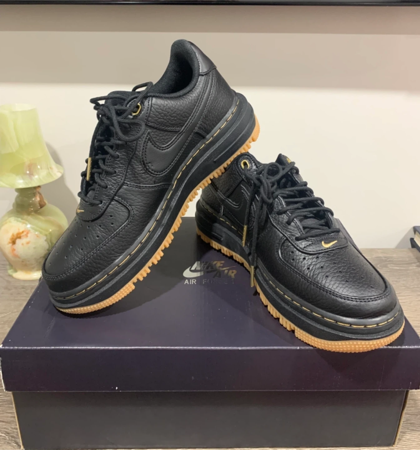These are a pair of black Nike Air Force 1 Low sneakers with a gum sole. They're a men's US size 6. Includes original box.