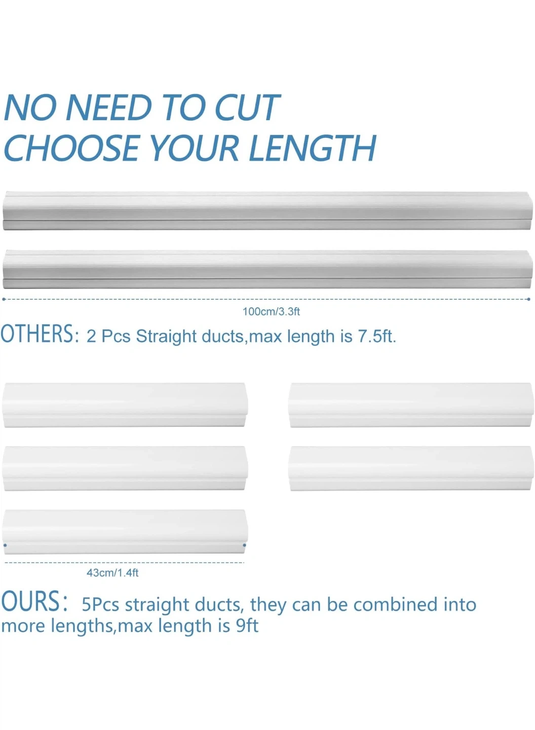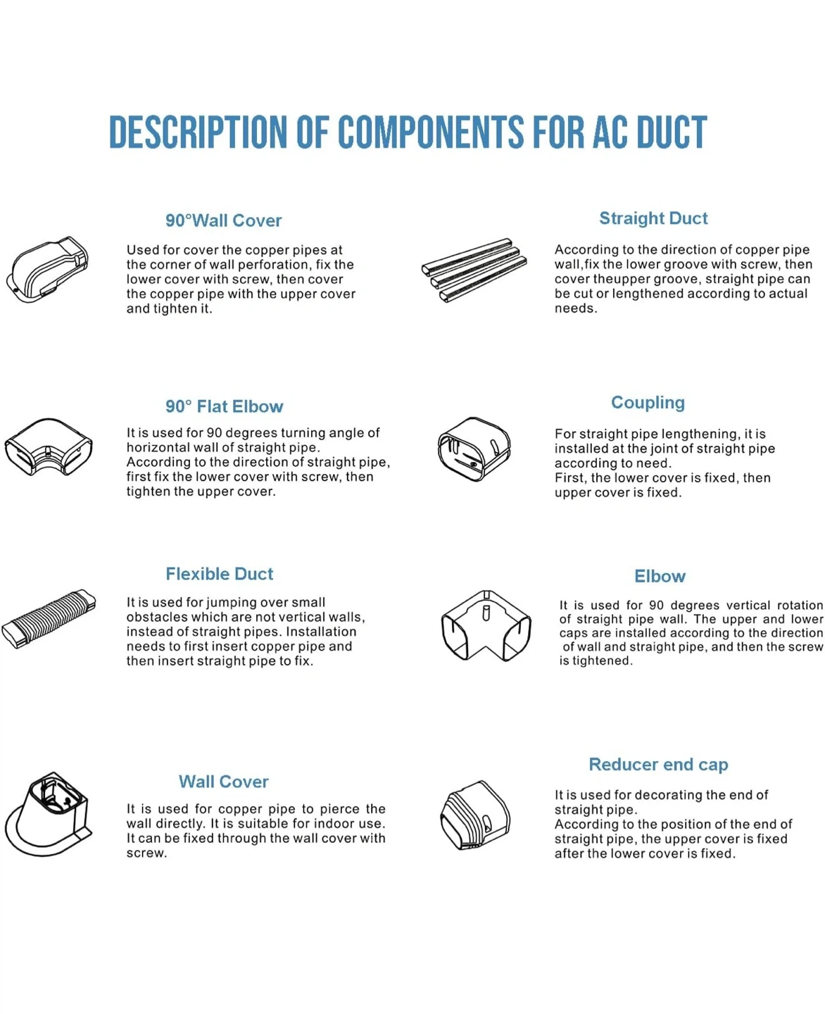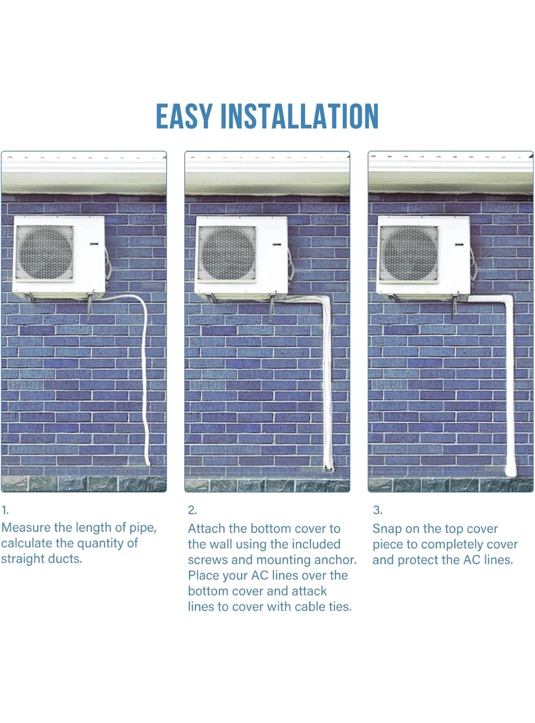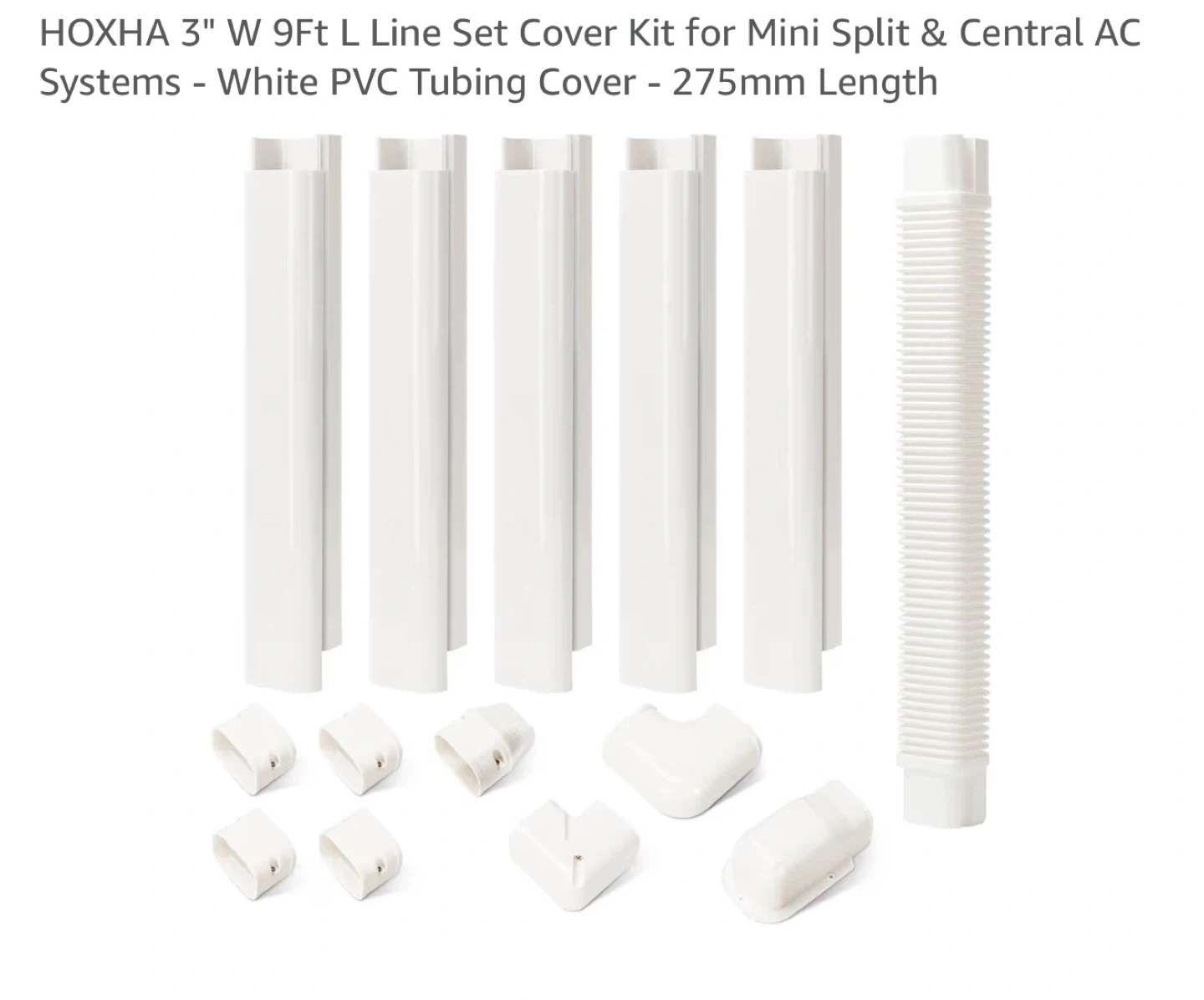 This HOXHA AC line set cover kit includes straight ducts, flexible duct, elbows, couplings, and a wall cover. It's made of white PVC tubing for mini split and central AC systems. The kit offers up to 9ft of coverage for your AC lines.