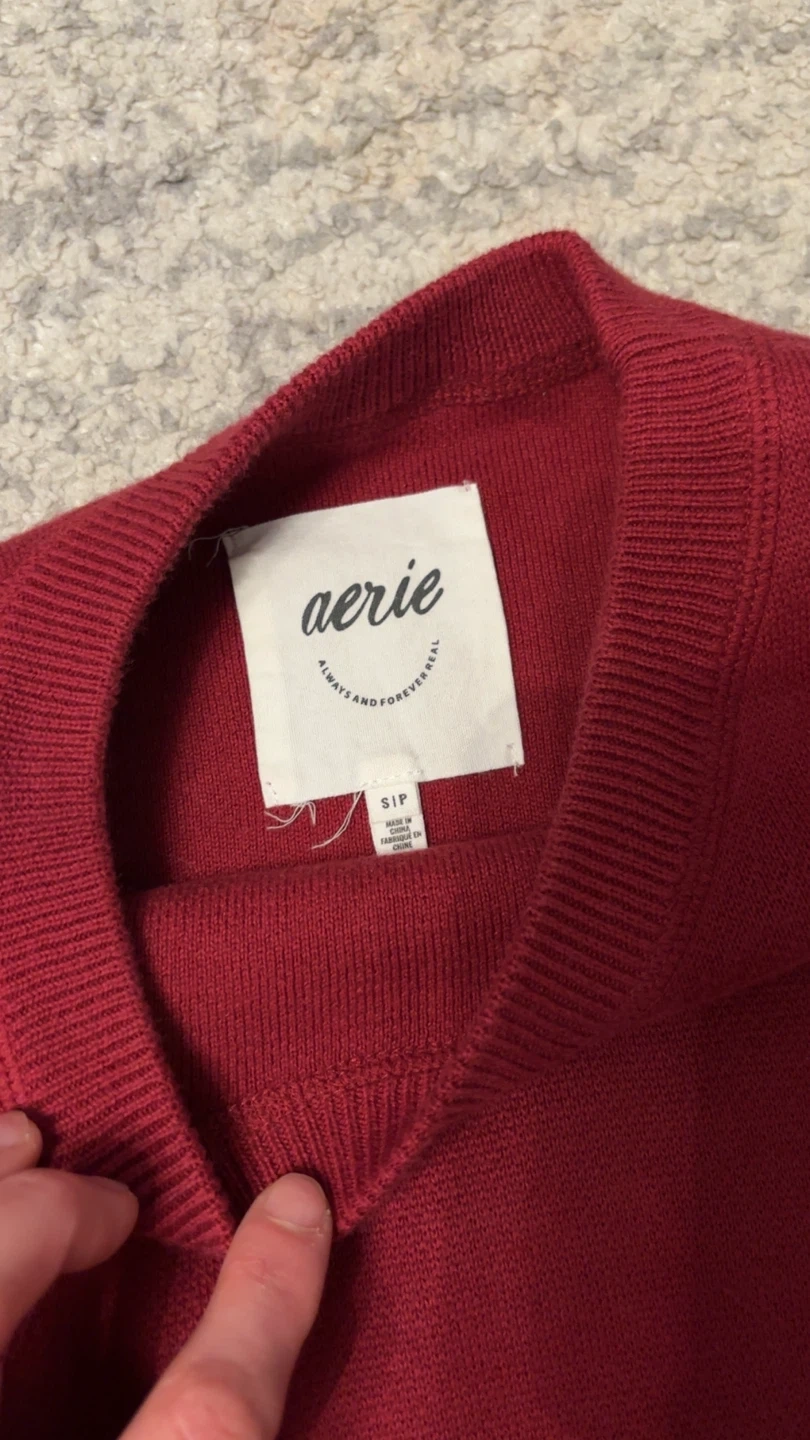 This is an Aerie crew neck sweater in a rich red colour. It's a size small. The sweater's material is soft and comfortable.