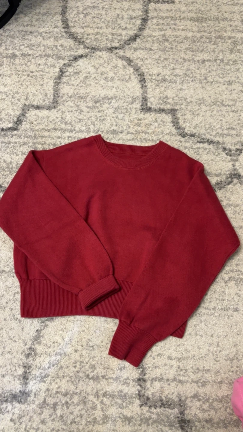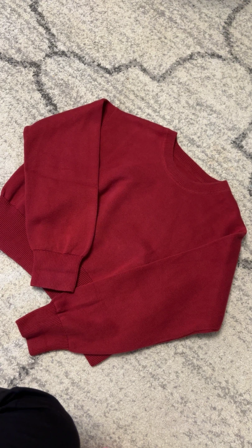 This is an Aerie crew neck sweater in a rich red colour. It's a size small. The sweater's material is soft and comfortable.