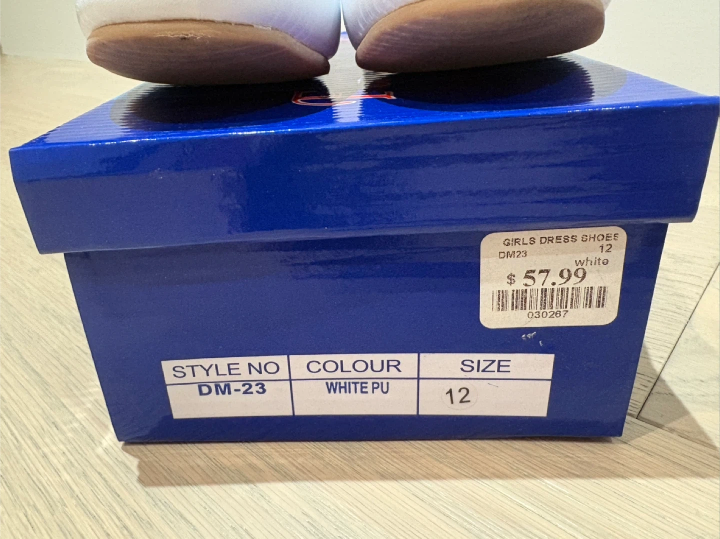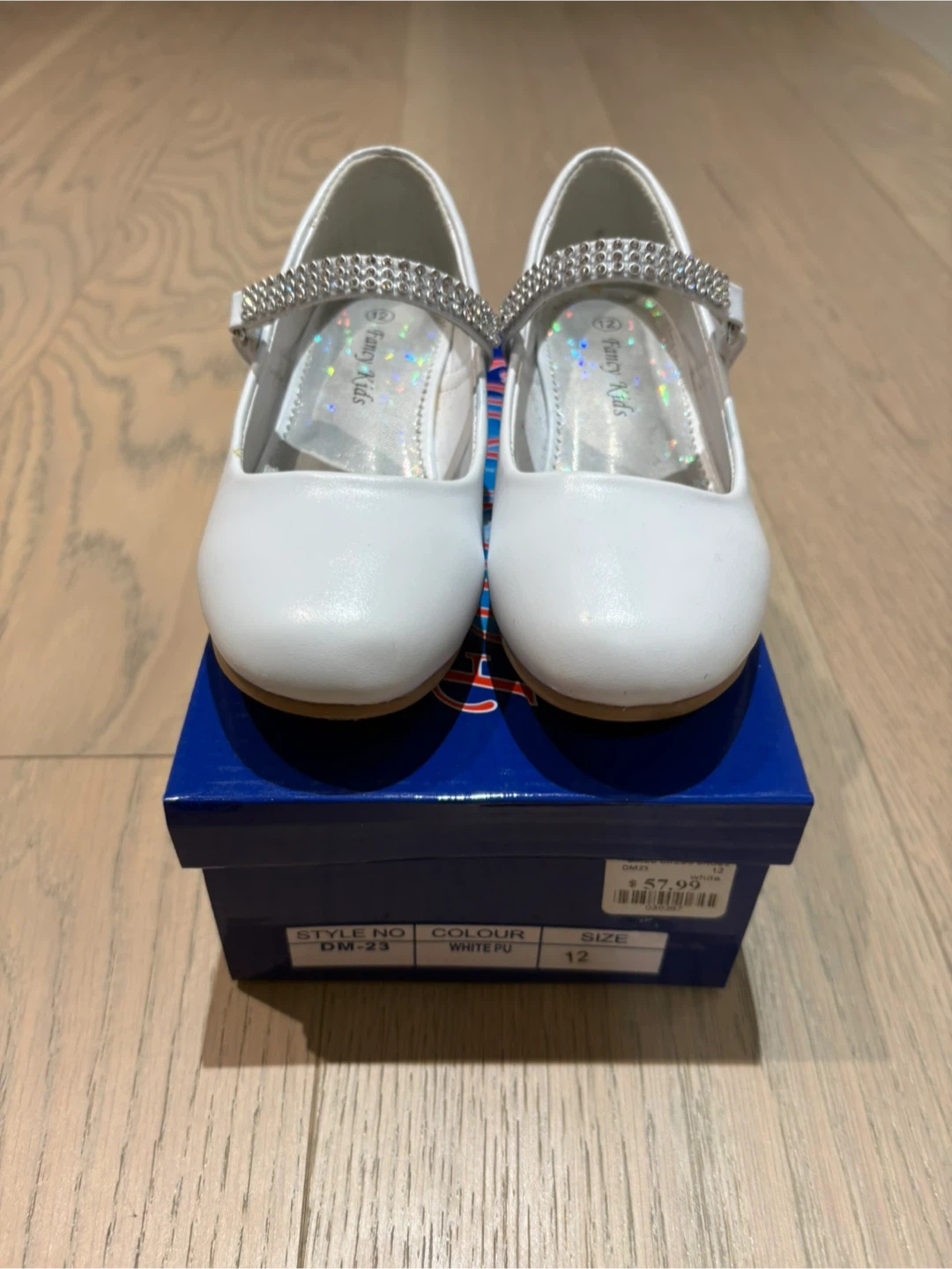 These adorable Fancy Kids dress shoes are perfect for your little one! They are white with a sparkly strap and come in size 12. The original box is included and the original price was $57.99. They were used once for a special occasion.