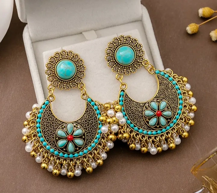 Add a touch of bohemian flair to your look with these beautiful turquoise and gold earrings! They feature intricate detailing and a unique design that's sure to catch the eye. Perfect for adding a pop of colour and style to any outfit