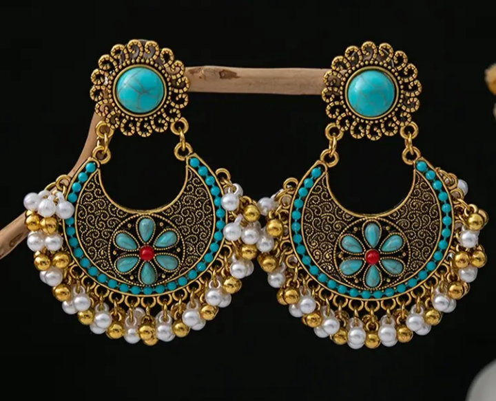 Add a touch of bohemian flair to your look with these beautiful turquoise and gold earrings! They feature intricate detailing and a unique design that's sure to catch the eye. Perfect for adding a pop of colour and style to any outfit