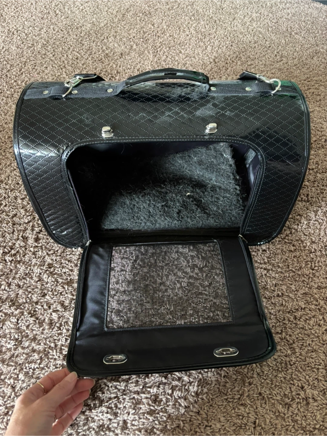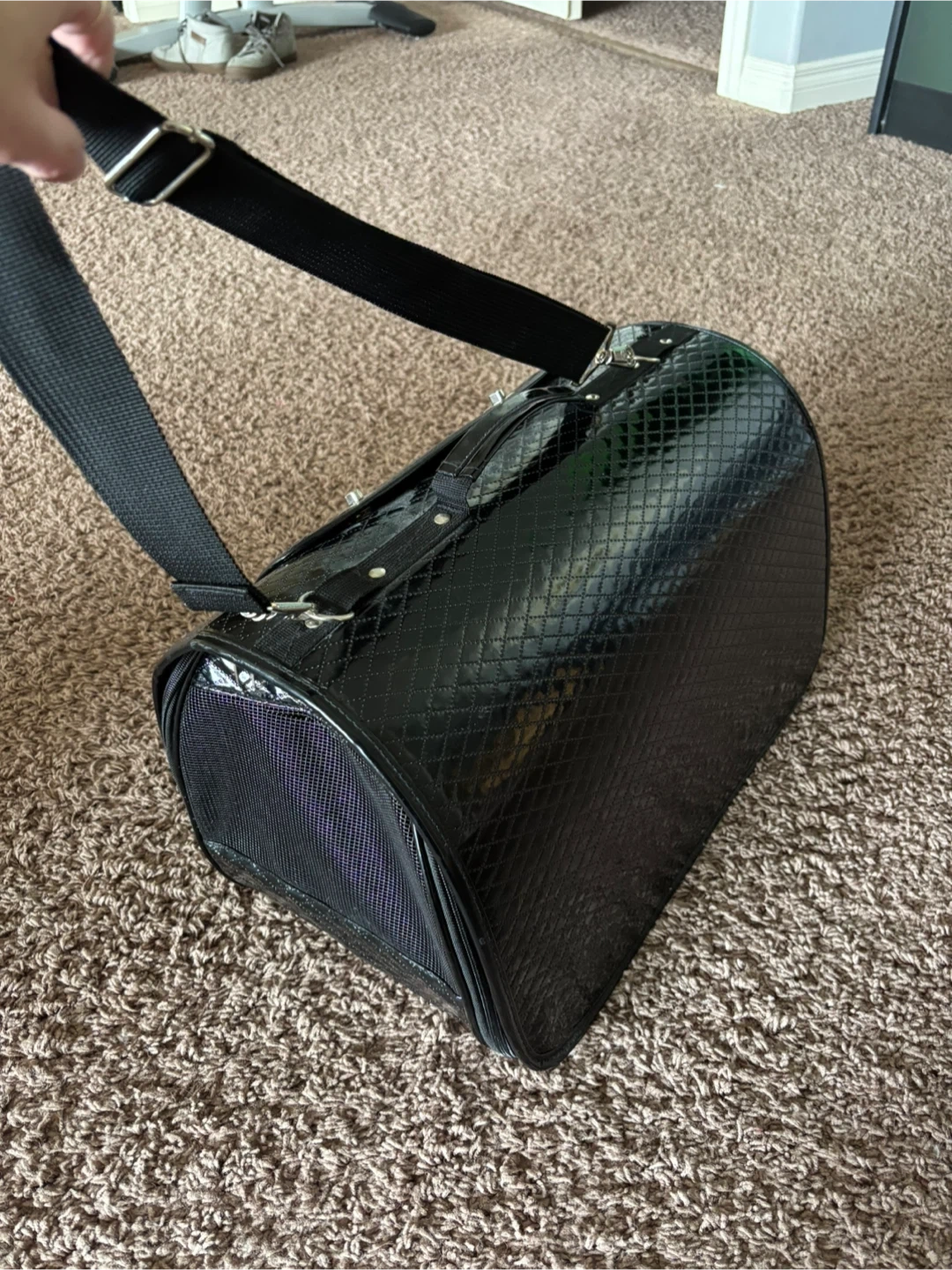 Selling a black pet carrier in great condition! It has a handle on top and a shoulder strap for easy carrying. The carrier has a quilted pattern and a mesh window for ventilation. Perfect for taking your furry friend on trips or to the vet!