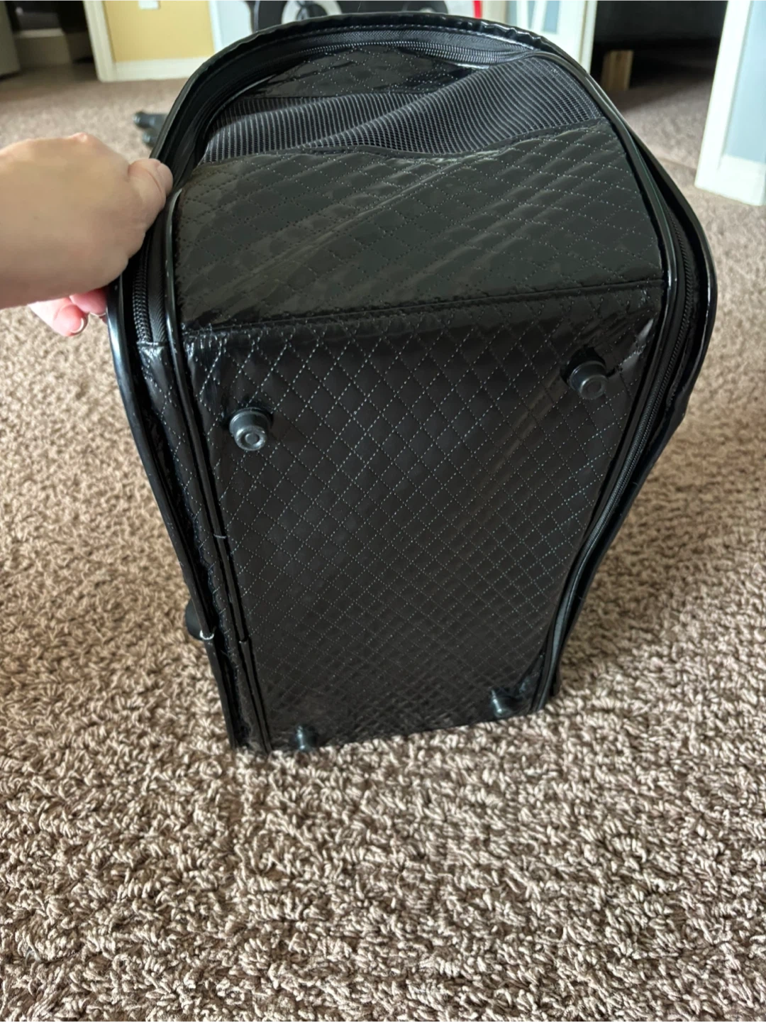 Selling a black pet carrier in great condition! It has a handle on top and a shoulder strap for easy carrying. The carrier has a quilted pattern and a mesh window for ventilation. Perfect for taking your furry friend on trips or to the vet!