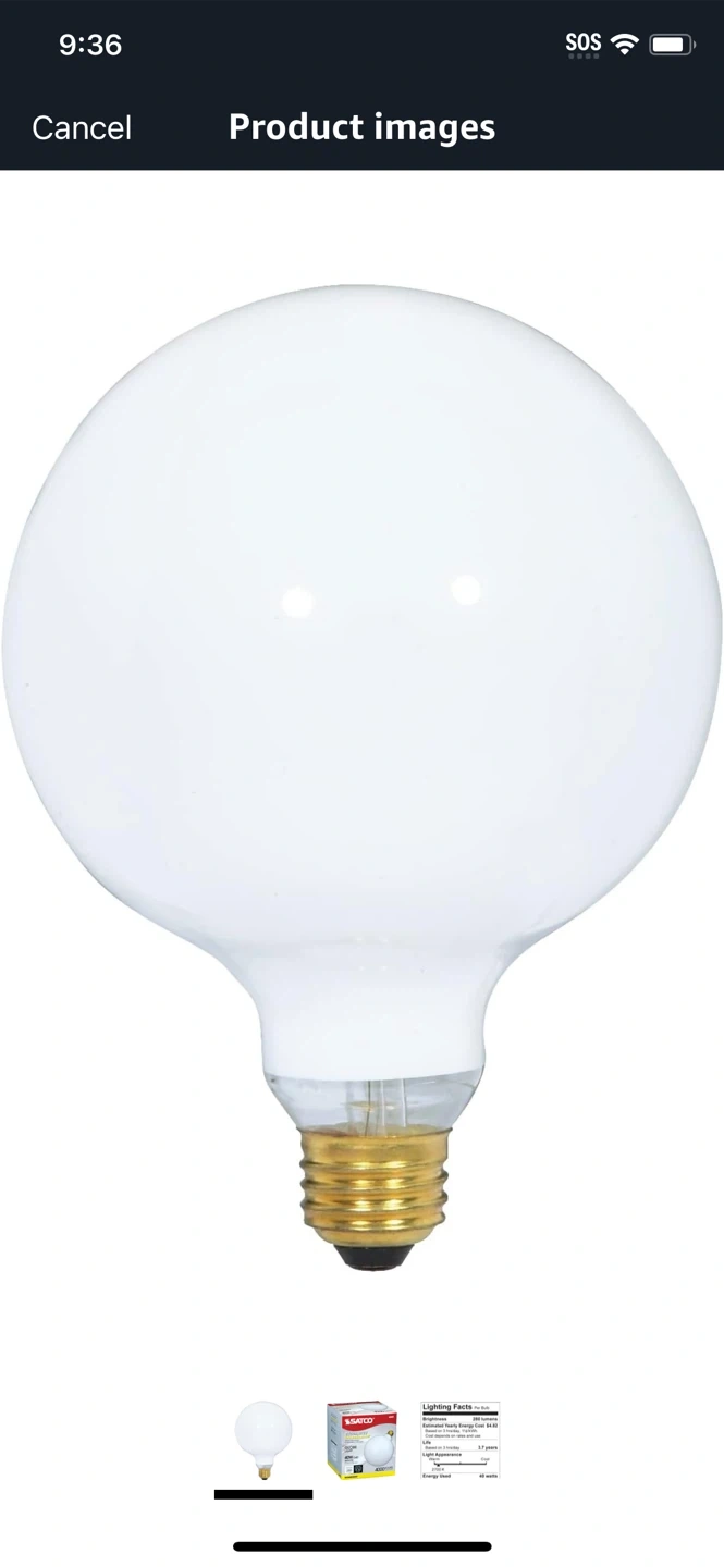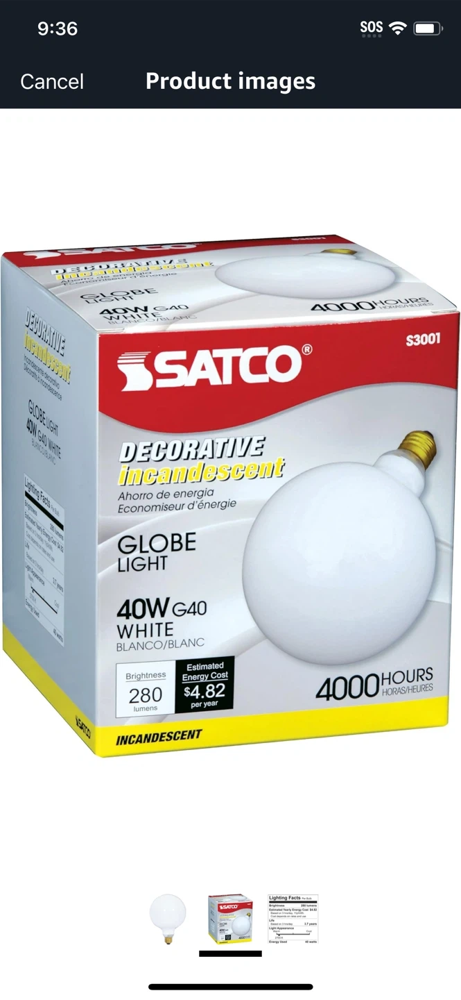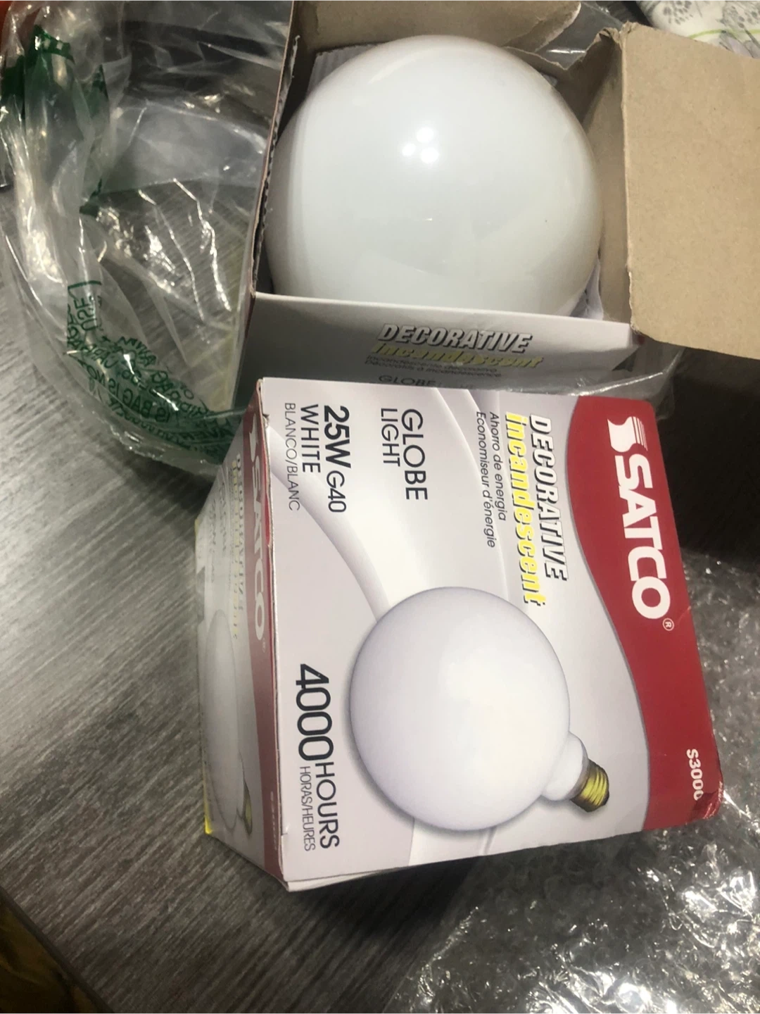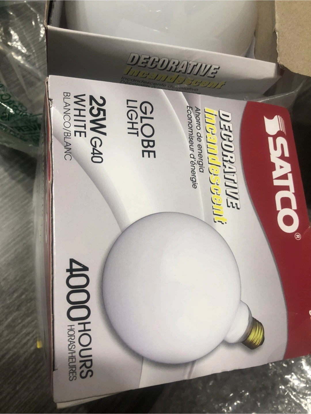 Selling a SATCO G40 globe light bulb in white. It's a decorative incandescent bulb with 4000 hours of light. The box is included!