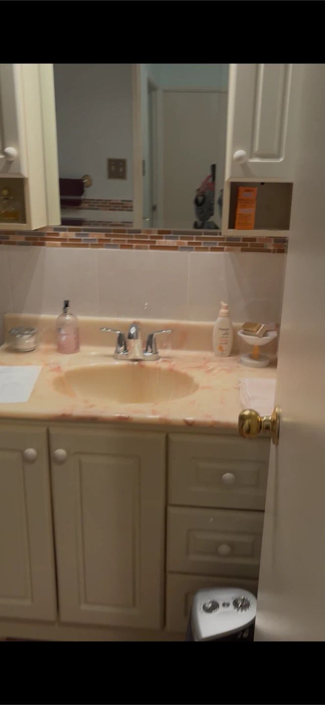 Selling a bathroom vanity with a mirror and 3 Potlights above the mirror. It's in good working condition and ready to be installed in your home. The vanity features a sink and storage space. The tower with the mirror also has a lot of storage. Please take a look at the photos for details!