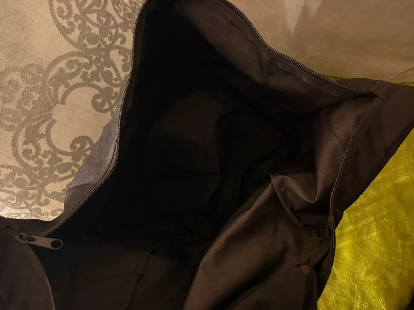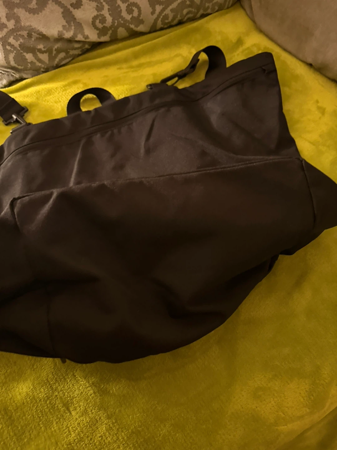This versatile black bag can be used as a backpack or a tote. It features a spacious main compartment with a zipper closure. Made from durable nylon material.