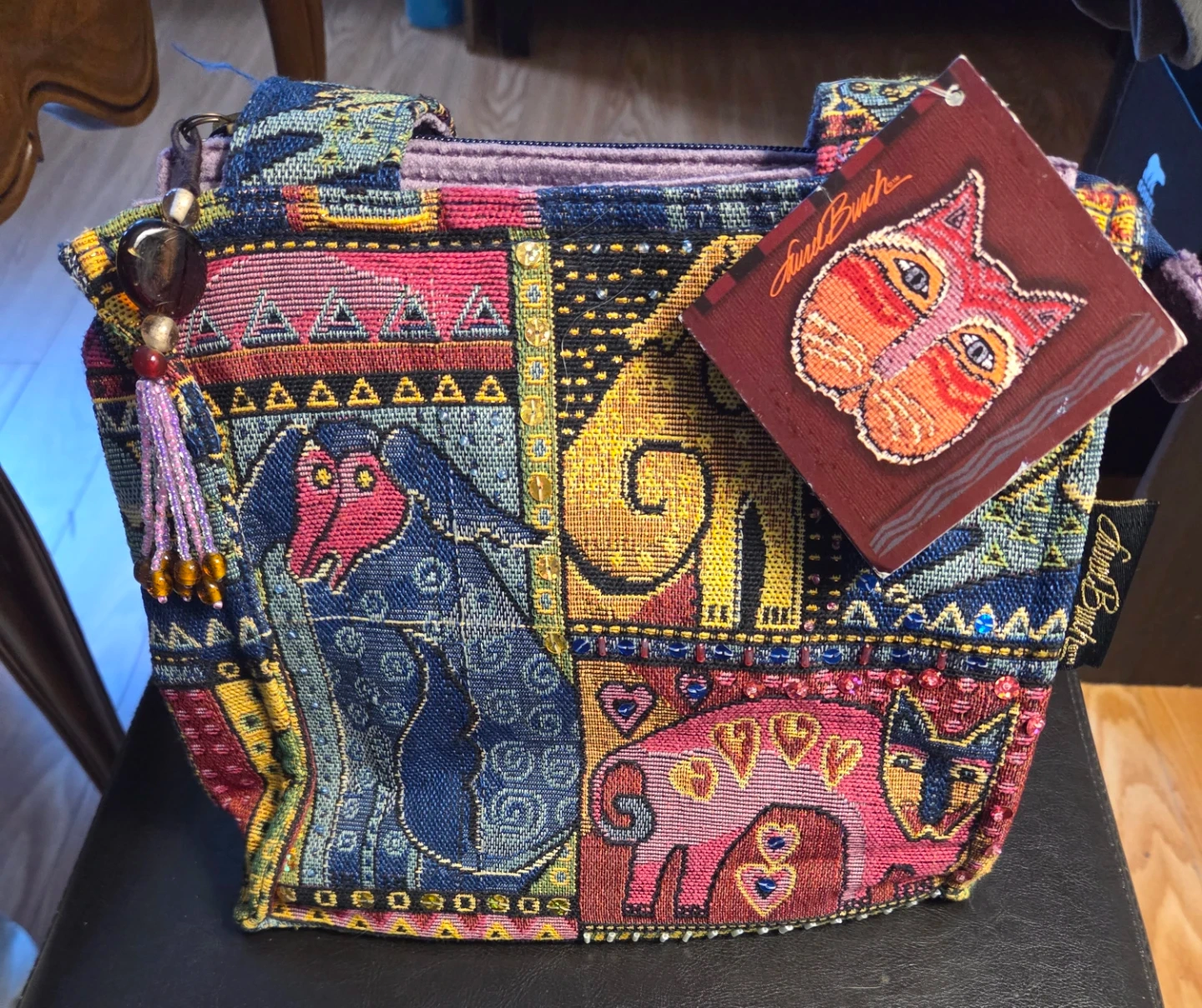 Selling a vibrant Judi Bunch tapestry shoulder bag featuring a whimsical cat design. It has a zippered closure and an interior zippered pocket. Perfect for adding a pop of colour to any outfit!