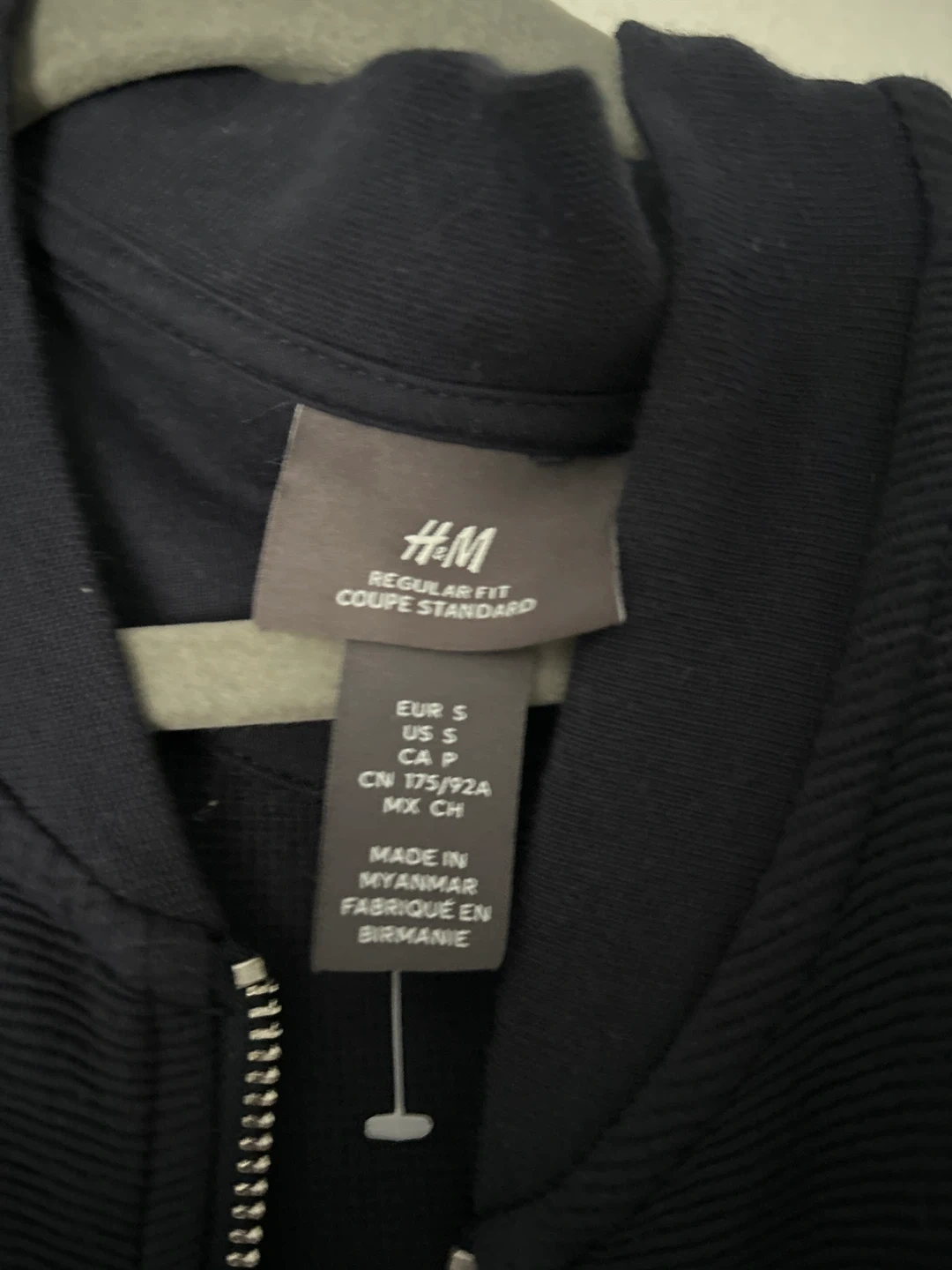 A dark navy H&M sweater. It's a men's size S with a regular fit. Made in Myanmar. Great for casual wear!