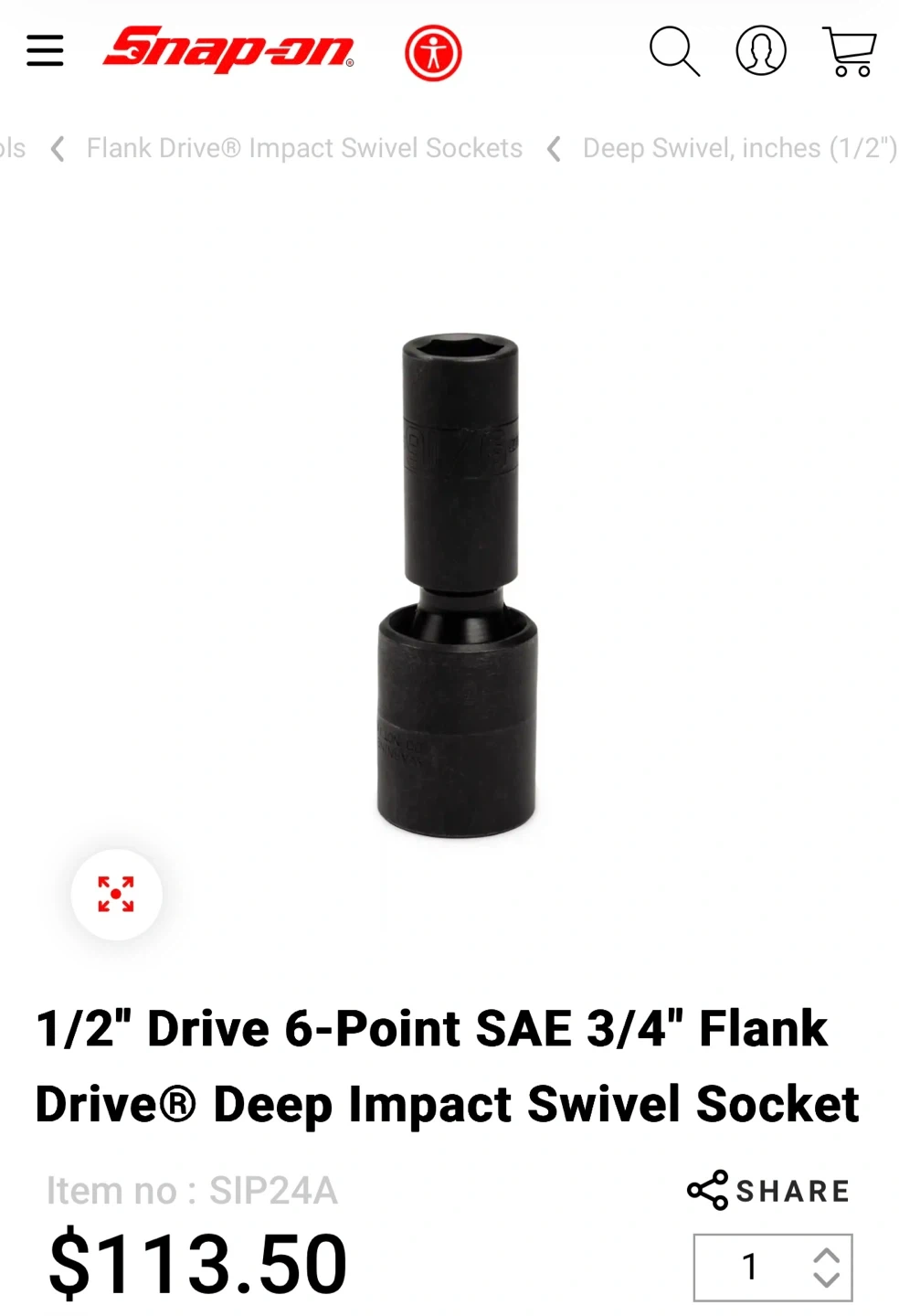 A Used Condition, Snap-on 1/2" Drive 6-Point SAE 3/4" Flank Drive Deep Impact Swivel Socket. Asking $80 or best offer, pickup in Brampton.