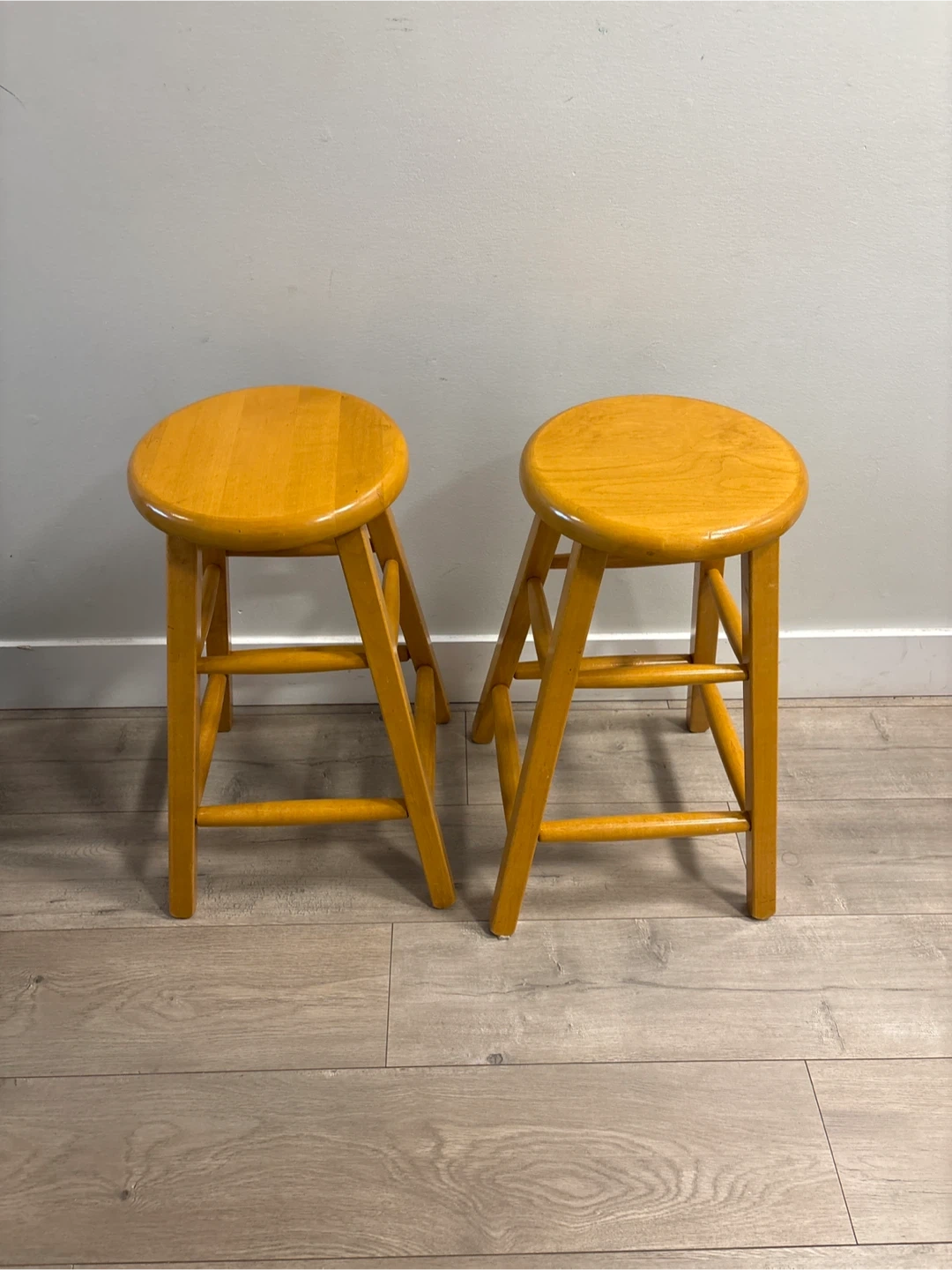 Selling a pair of matching wooden bar stools with a light oak finish. They're sturdy and have a simple, classic design. Each stool has a comfortable round seat and supportive crossbars between the legs. Great for adding extra seating to a kitchen island or home bar!