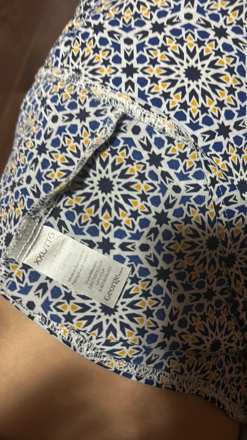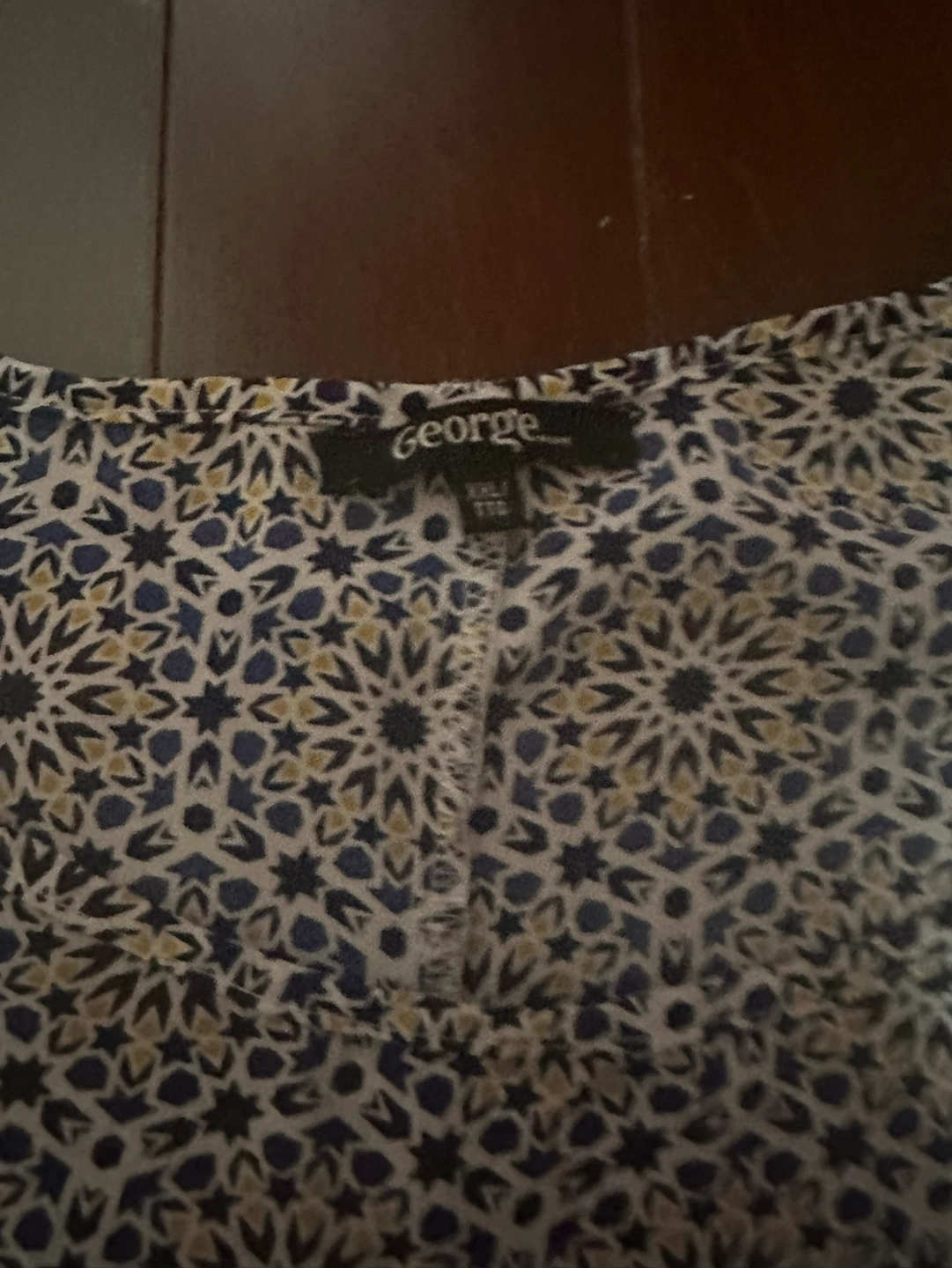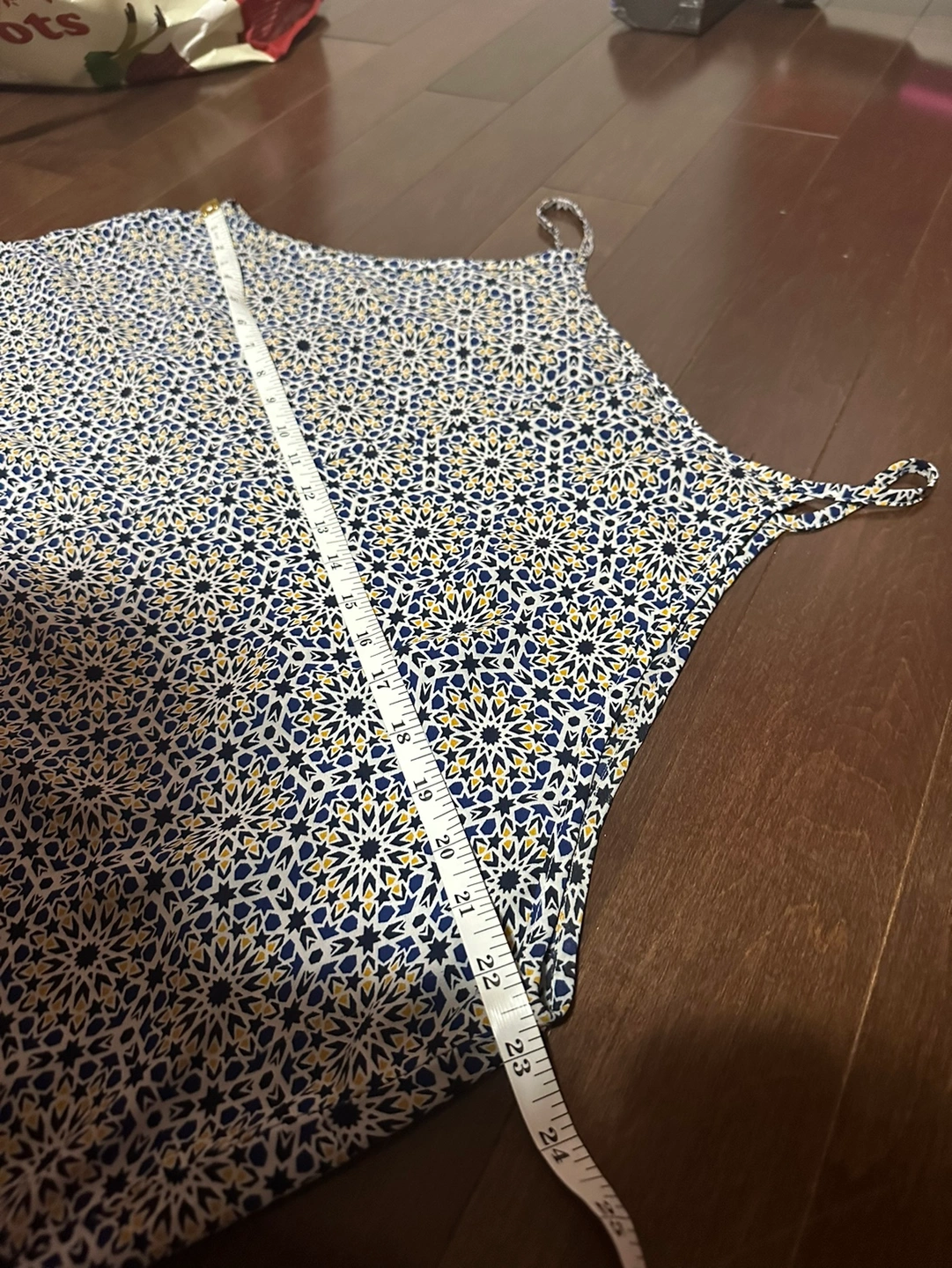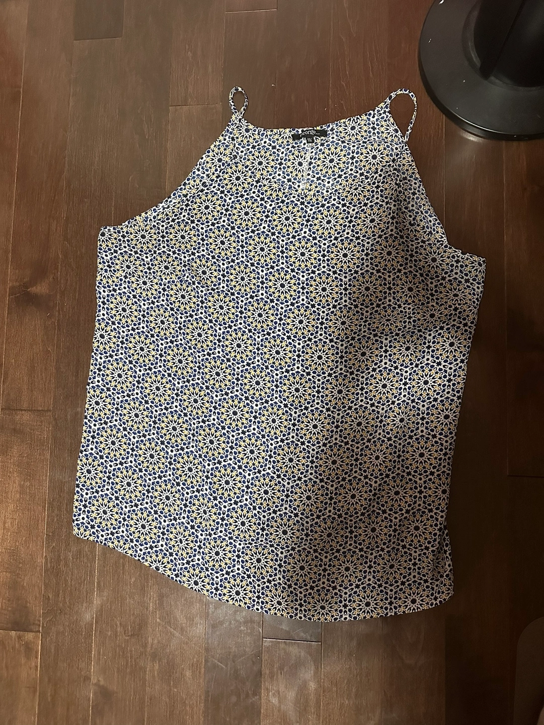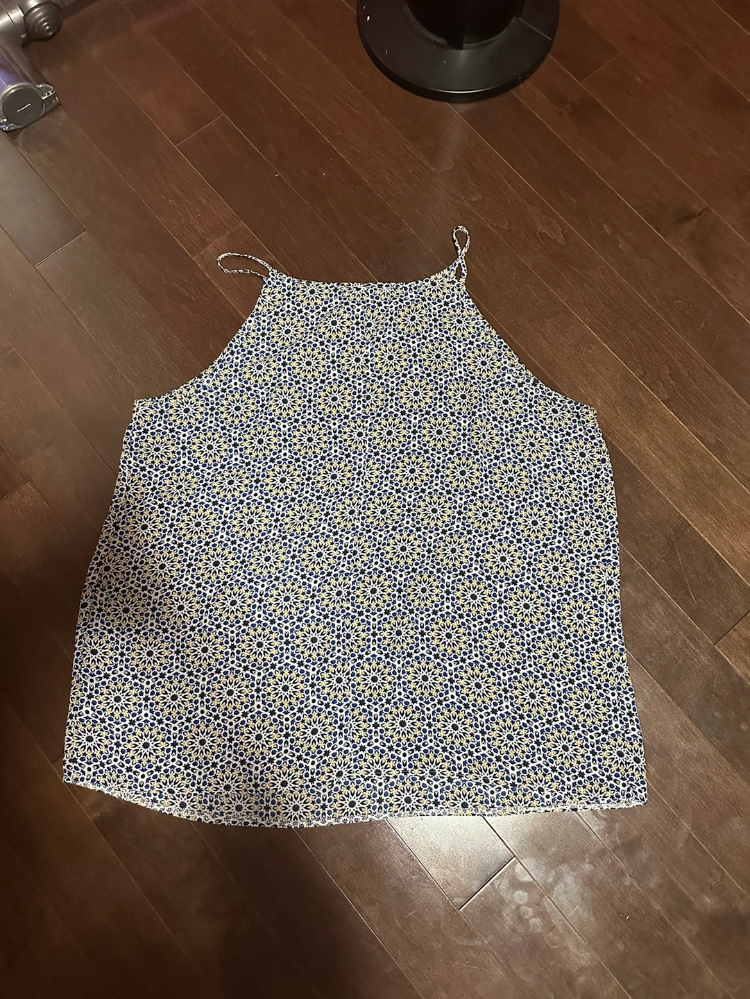 A blue, white, and gold patterned tank top. It is a halter style top with a scoop neck. The top is sleeveless. The fabric is light and airy. It is made by George and has a size XL tag. It measures 23 inches across the bust. The straps are adjustable. The top is in good condition.