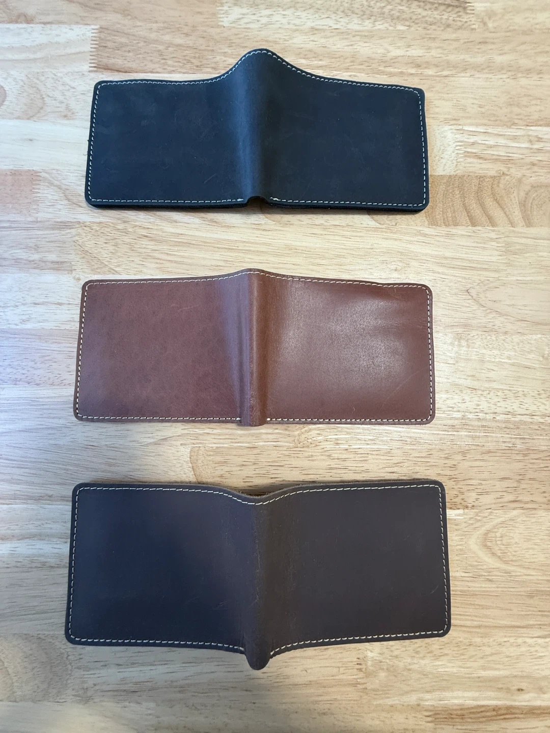 Selling a set of three never used handcrafted leather bifold wallets. They come in black, brown, and cognac colours. Nab Leather crafted from soft full grain one solid piece of leather. Minimal stretch and will never break or crack in the leather.