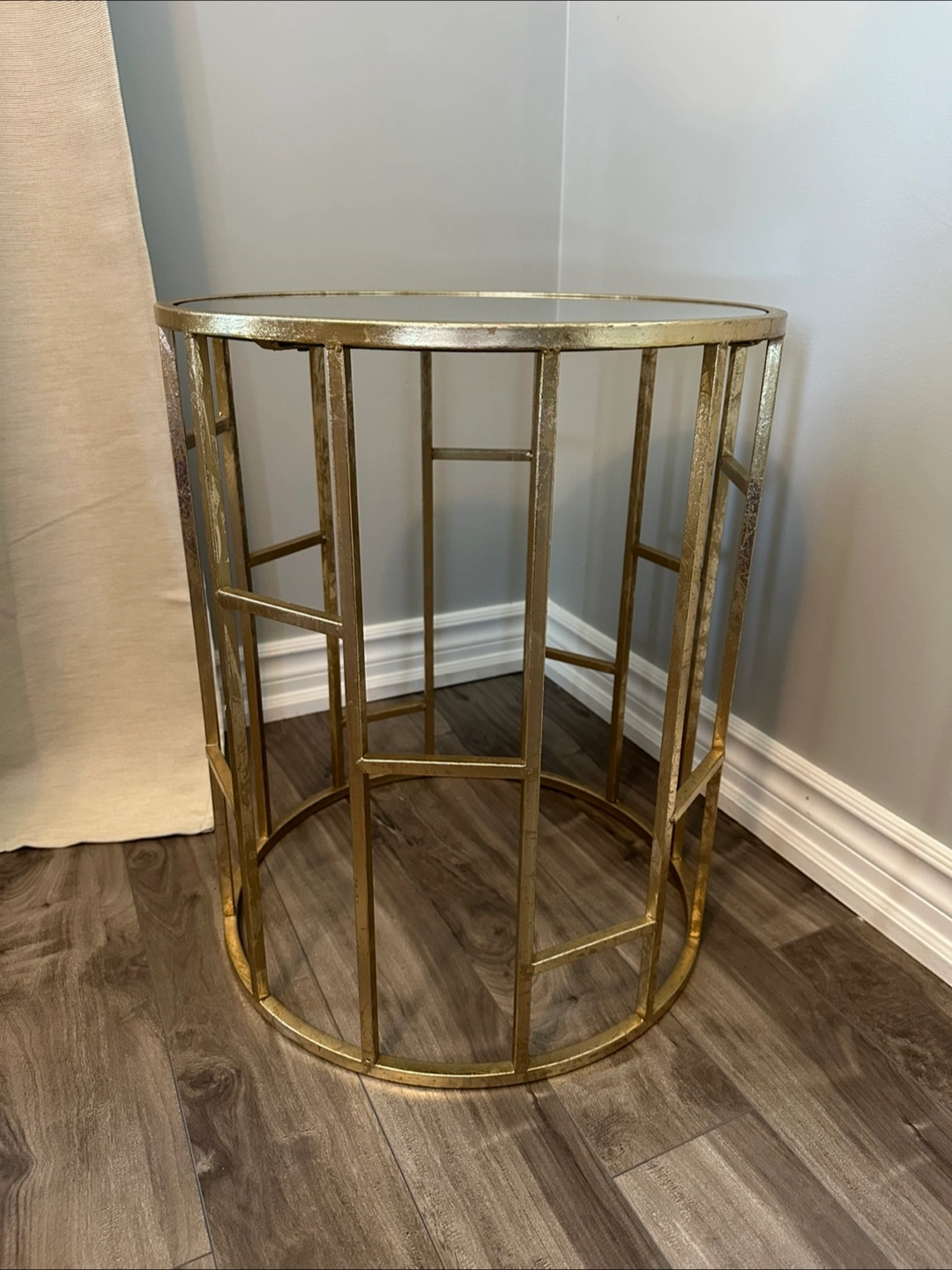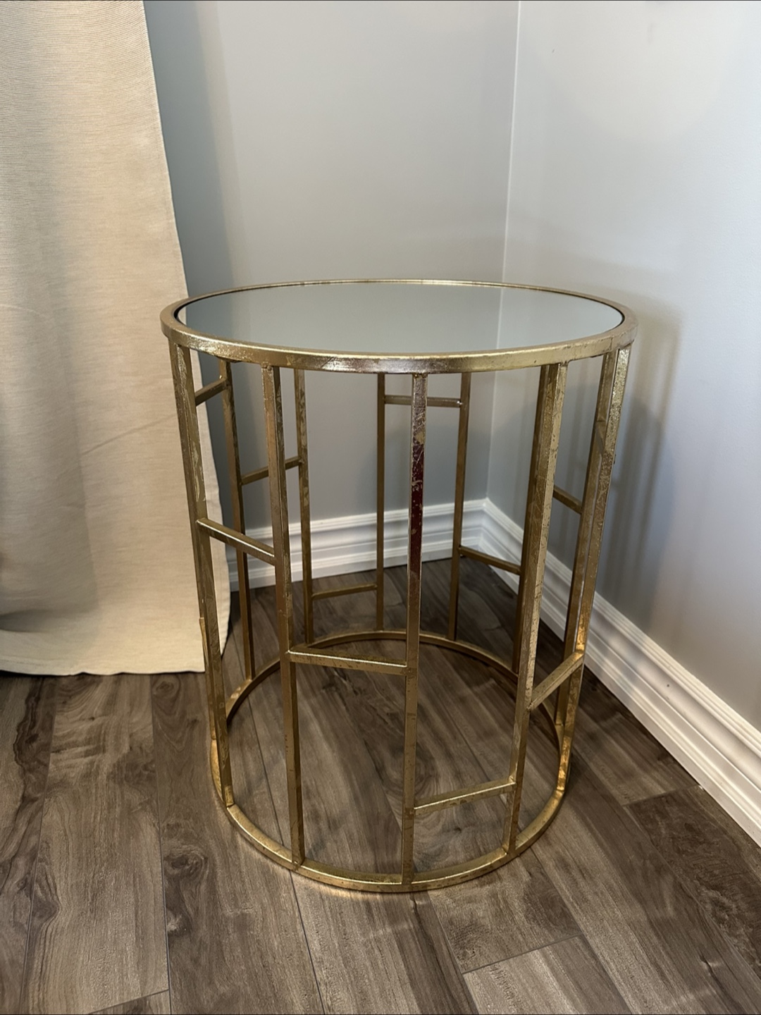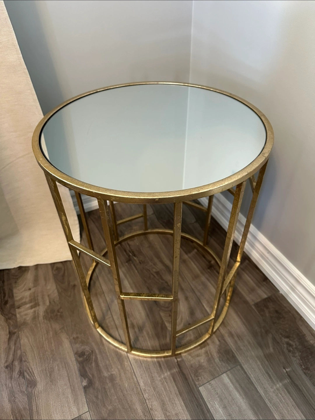Selling a lovely round side table! It features a mirrored top and a gold-coloured metal frame. It would be a great addition to any living room or bedroom.