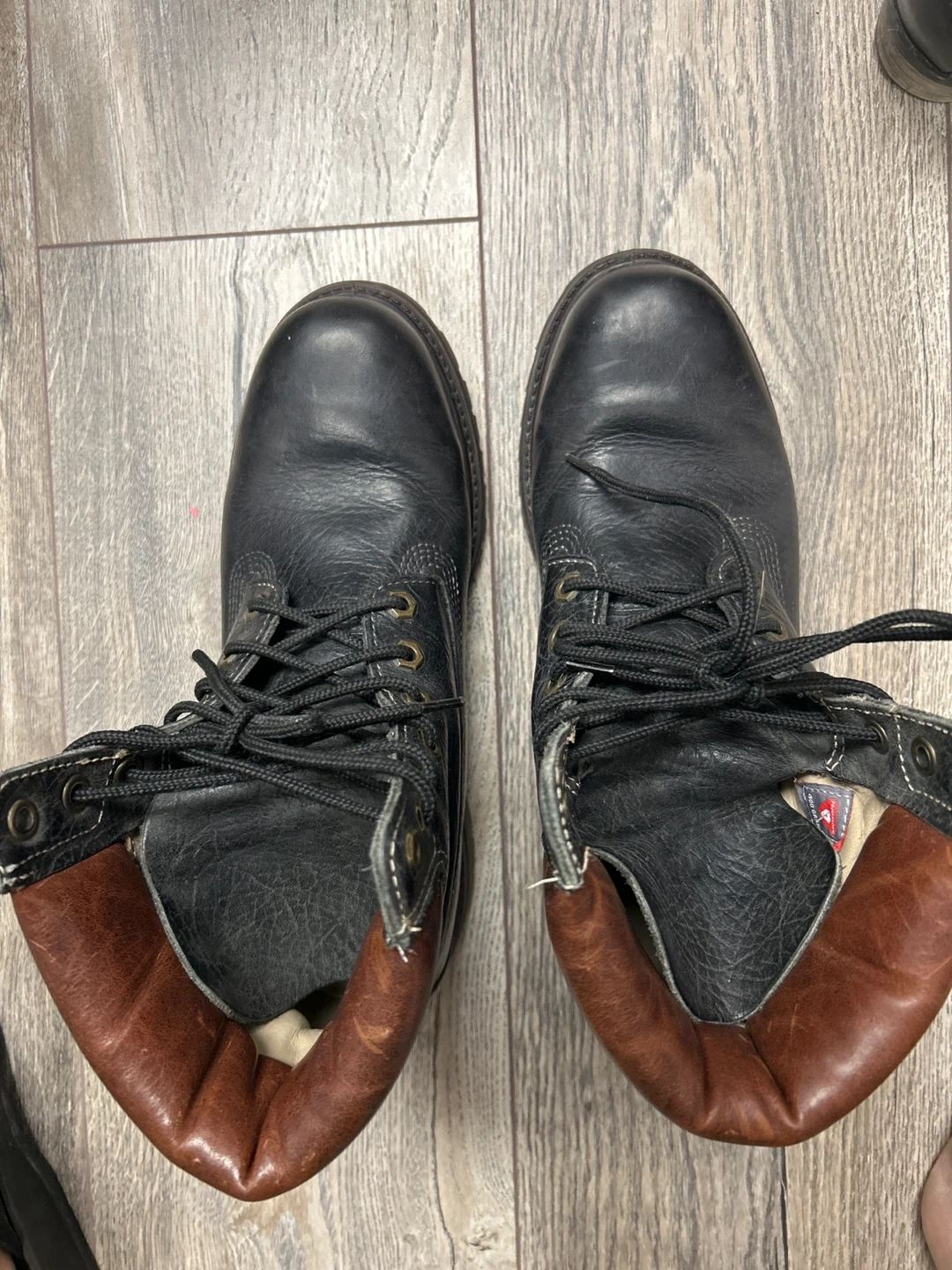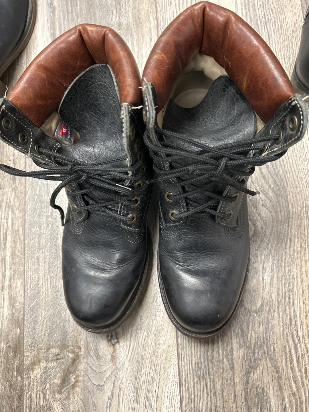 These are black leather work boots. They feature a lace-up closure and a durable sole. The brown collar adds a classic touch to the design. They're suitable for tough jobs.they look unisex