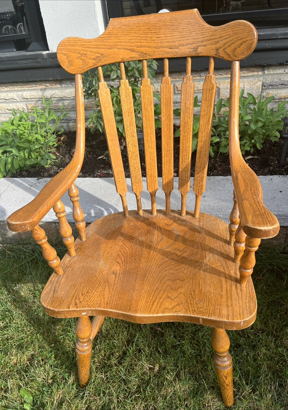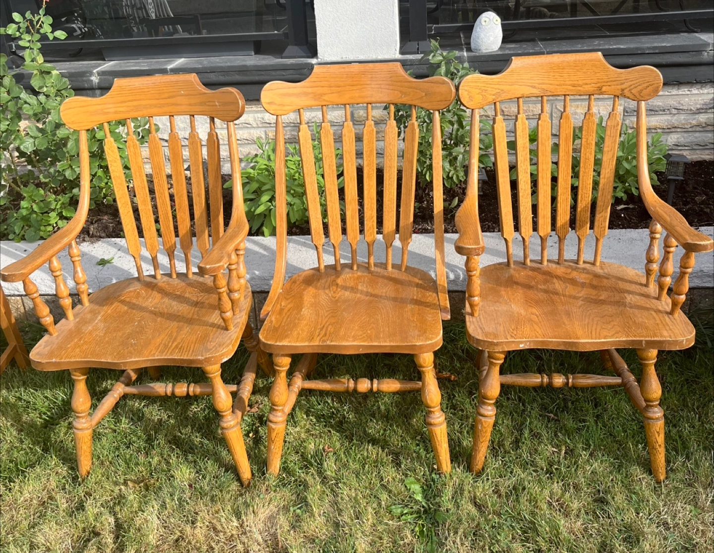 Selling vintage wooden oak arm chairs! They're in good condition and would look great in a dining room or kitchen. They have a classic, timeless design.