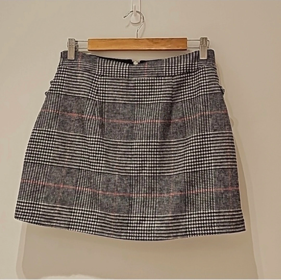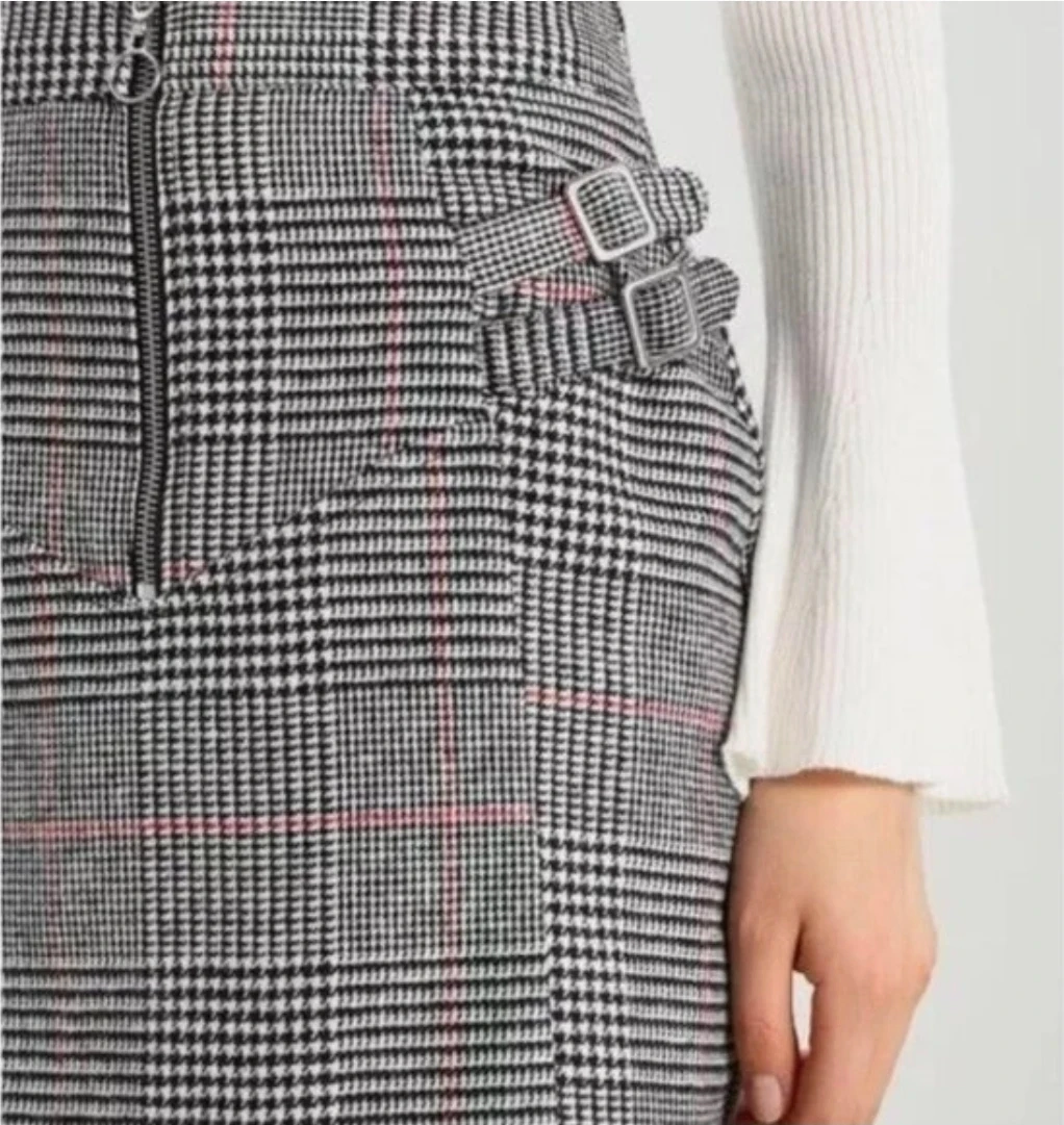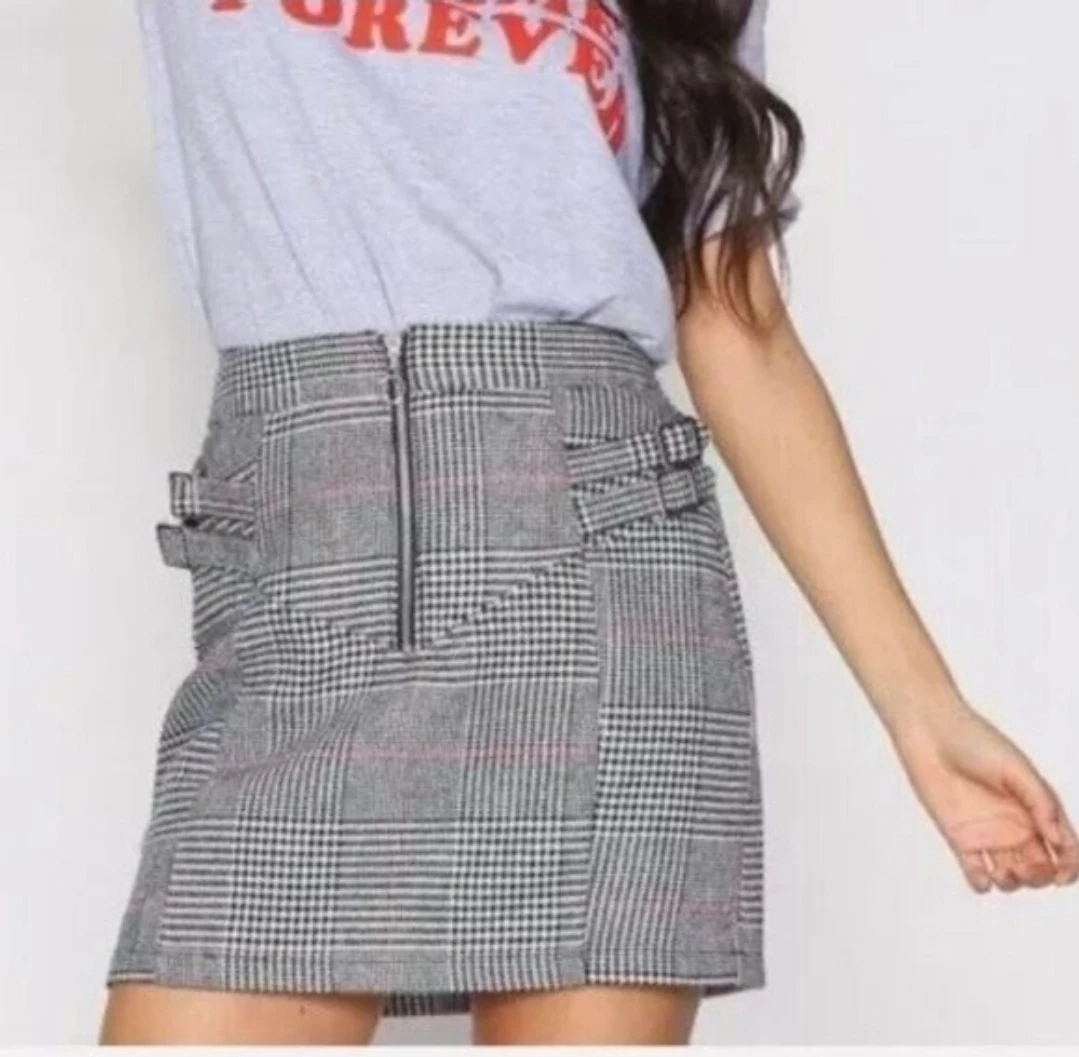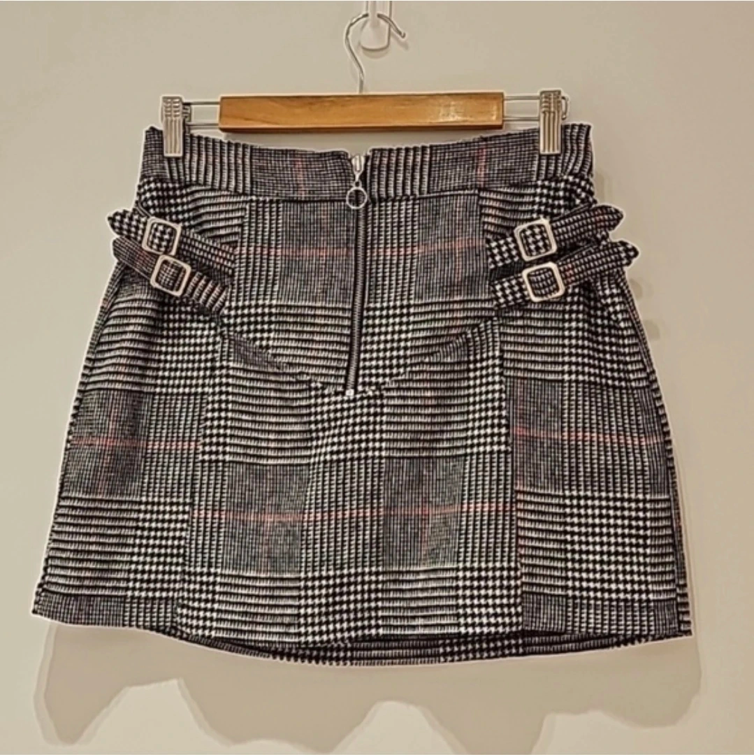 This stylish mini skirt features a classic plaid pattern and decorative buckle details on the sides. It has a front zipper closure for easy wear. It's a great choice for adding a trendy touch to your outfit. Material is a woven blend.