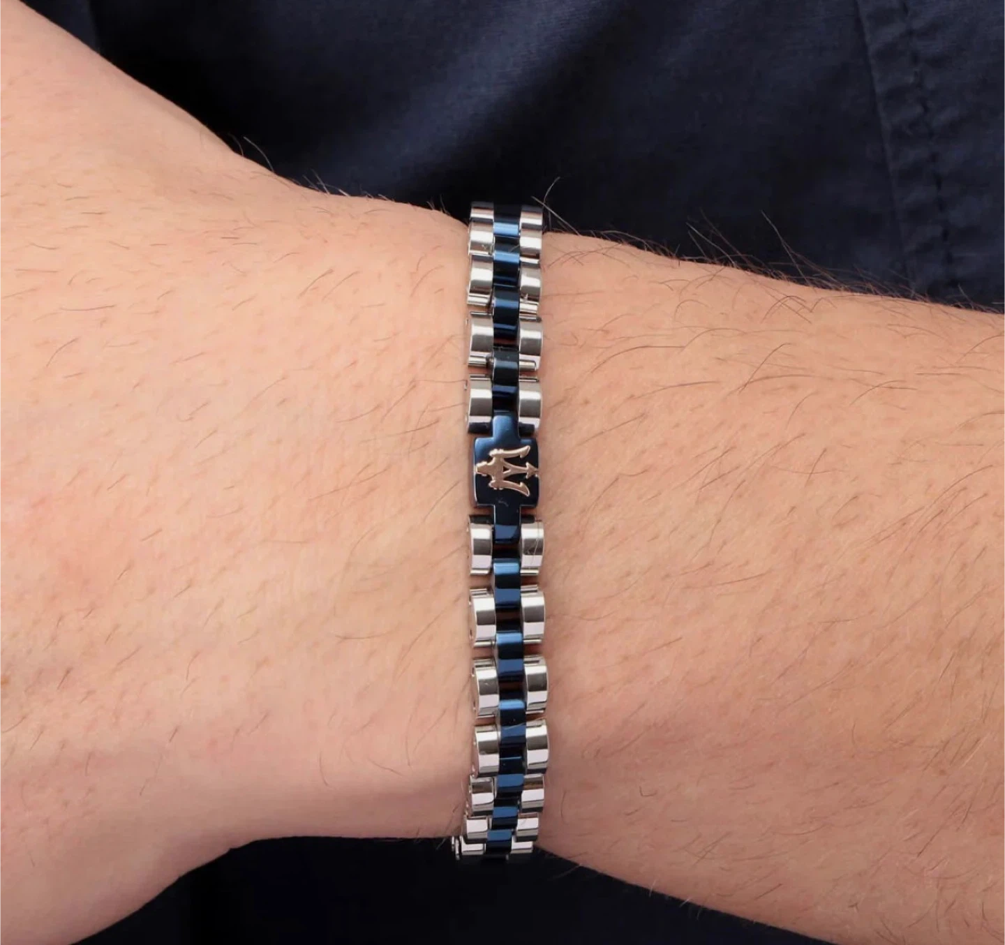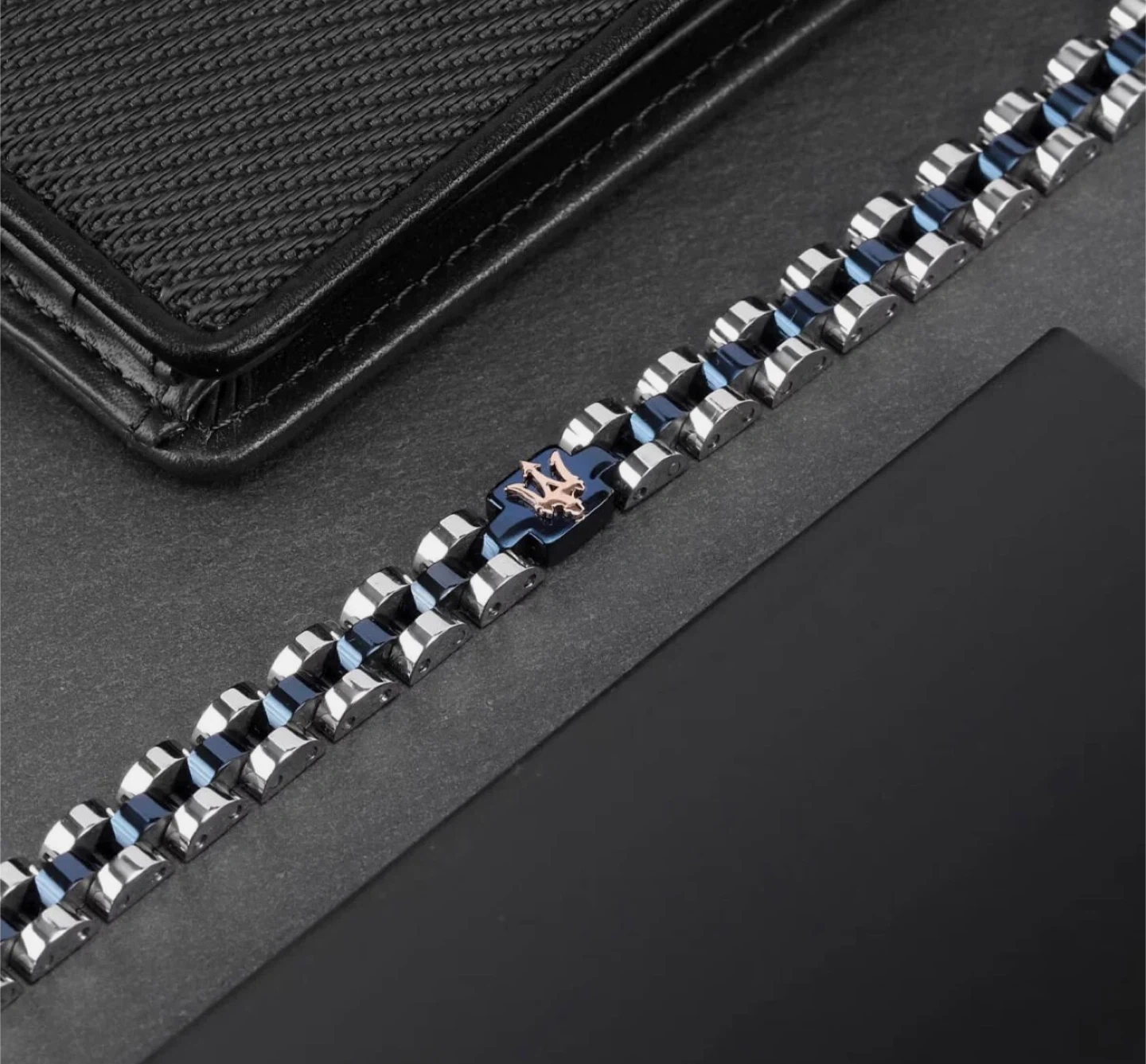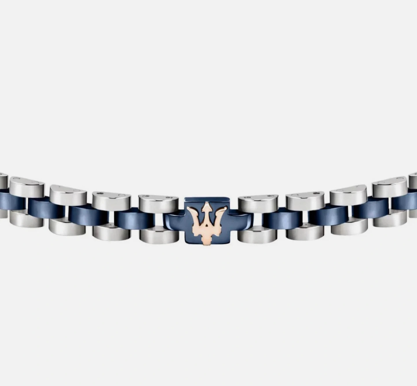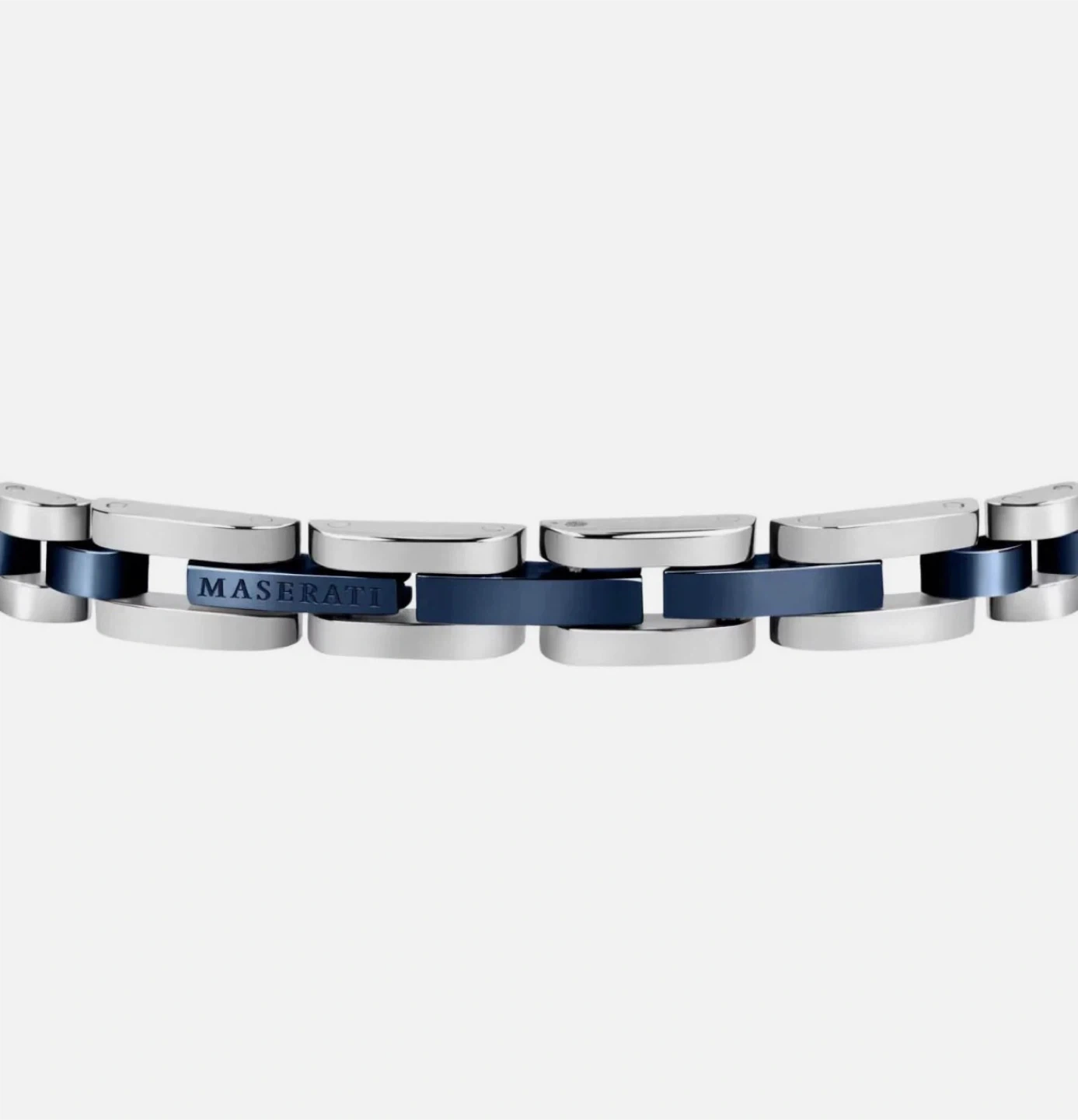 NEW Maserati link bracelet with polished stainless steel and brushed blue accents. Features the iconic Trident logo on the clasp. It's a stylish accessory for everyday wear.