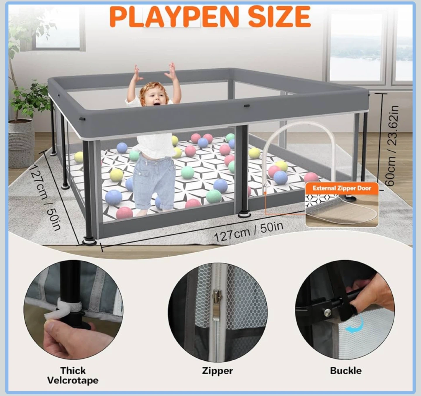 This playpen is 127cm by 127cm and 60cm tall, perfect for little ones to play safely. It features a zipper door for easy access and is made with durable materials. It's spacious enough for toys and a mat. This playpen is great for keeping your child entertained and secure.