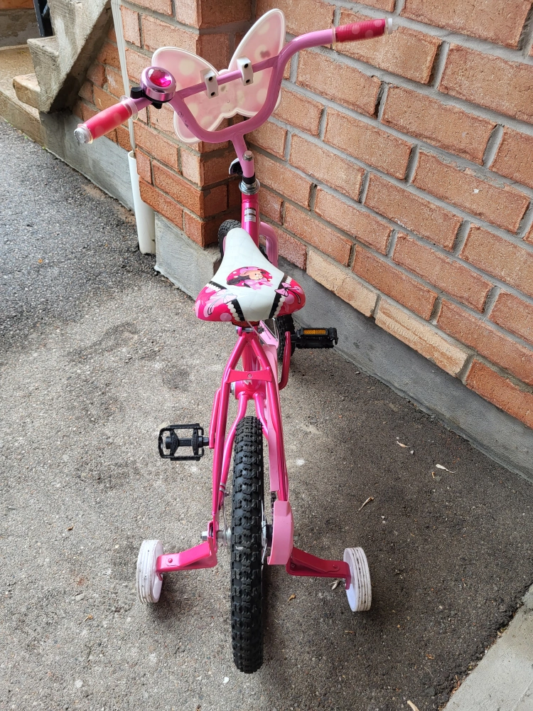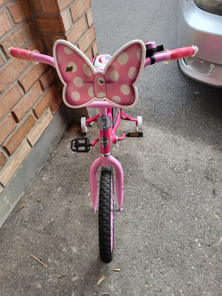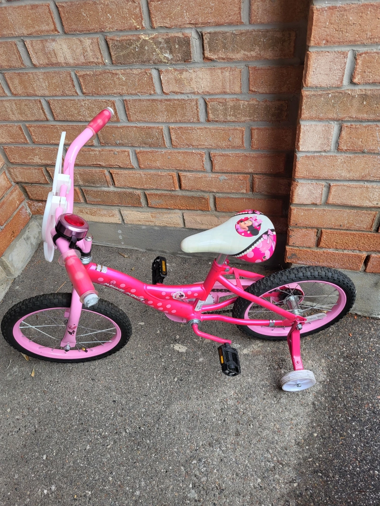 Minnie mouse bicycle for little girls. Training wheels and Barbie bell signal included. Pickup Hurontario and Eglinton.