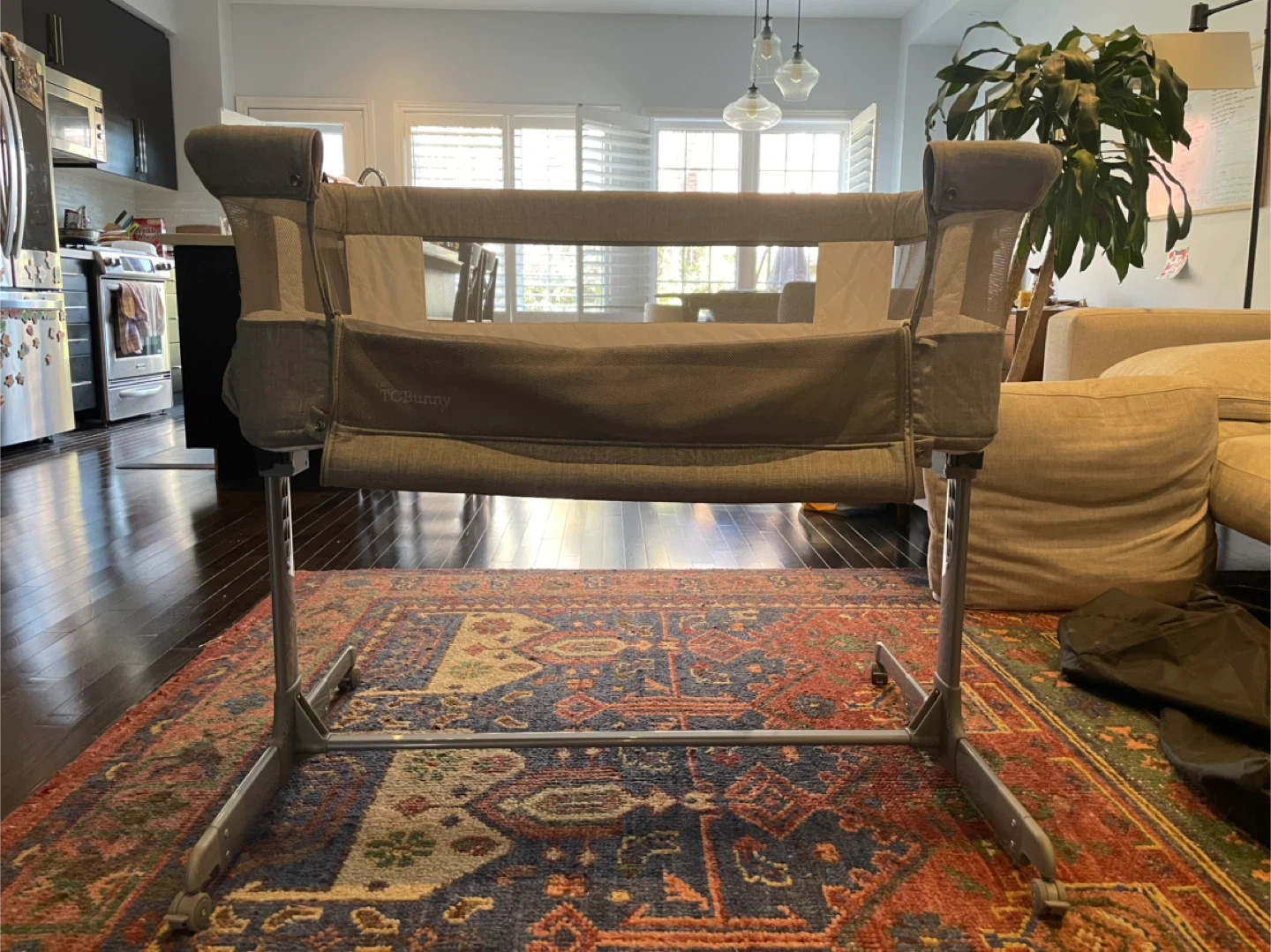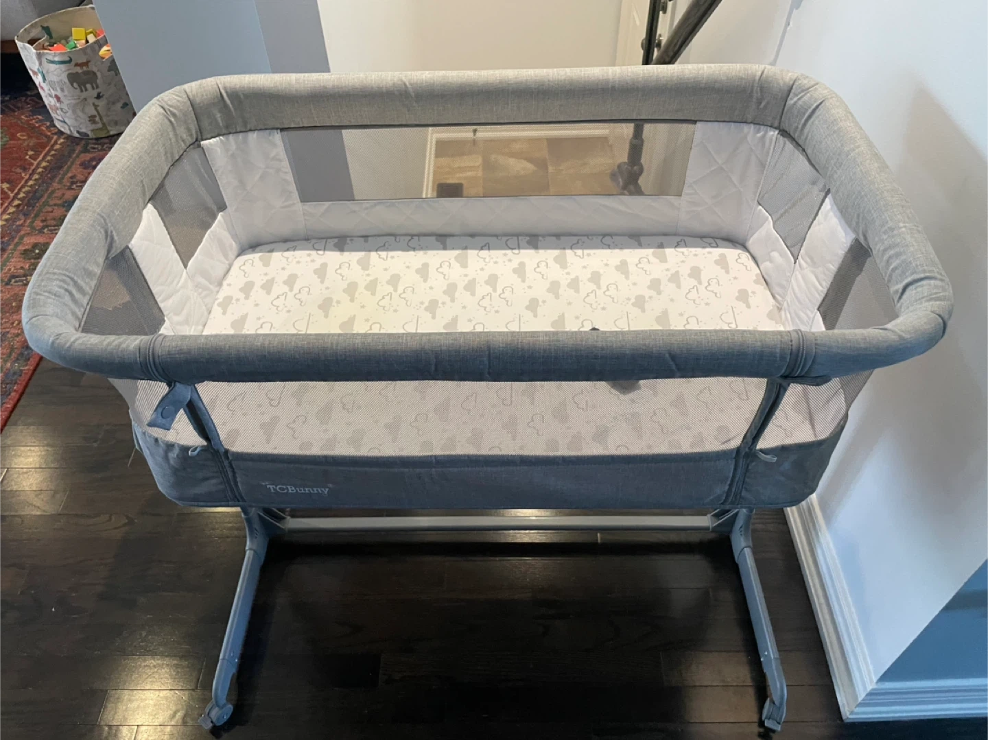 15Selling a TCBunny bassinet in excellent condition! It allows for co-sleeping with its adjustable side that lowers and attaches to the side of your mattress with straps. It's a lovely grey colour and comes with a carrying case for easy transport or storage. The bassinet is perfect for newborns and infants, providing a safe and cozy sleeping space. The mesh sides ensure good airflow, and the adjustable height makes it convenient to use next to your bed. Includes the original accessories and mattress pad!
