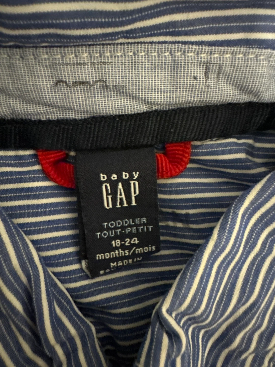 Here's a cute Baby Gap toddler shirt, perfect for your little one! It's sized for 18-24 months and features a classic blue and white striped design
