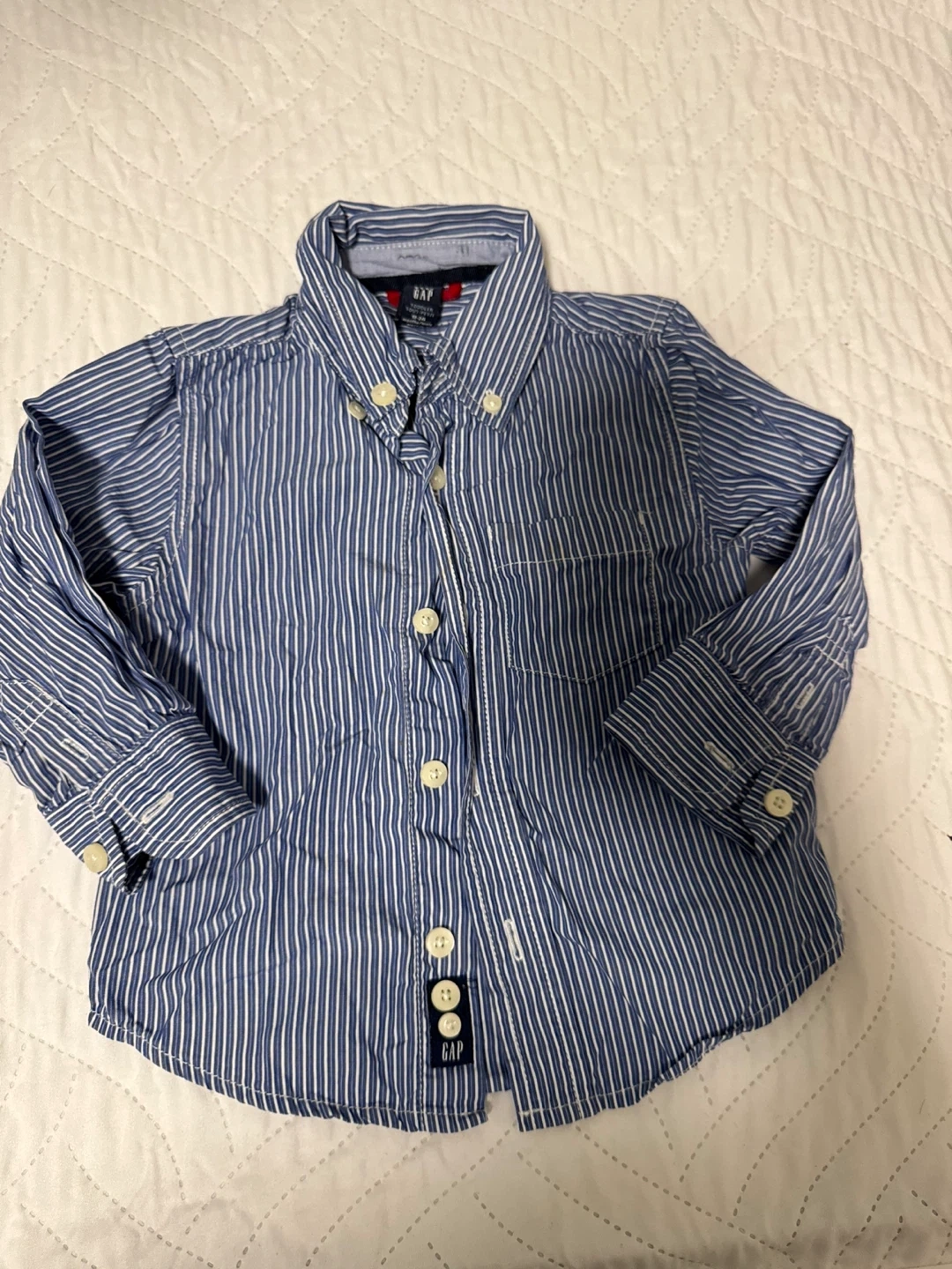 Here's a cute Baby Gap toddler shirt, perfect for your little one! It's sized for 18-24 months and features a classic blue and white striped design