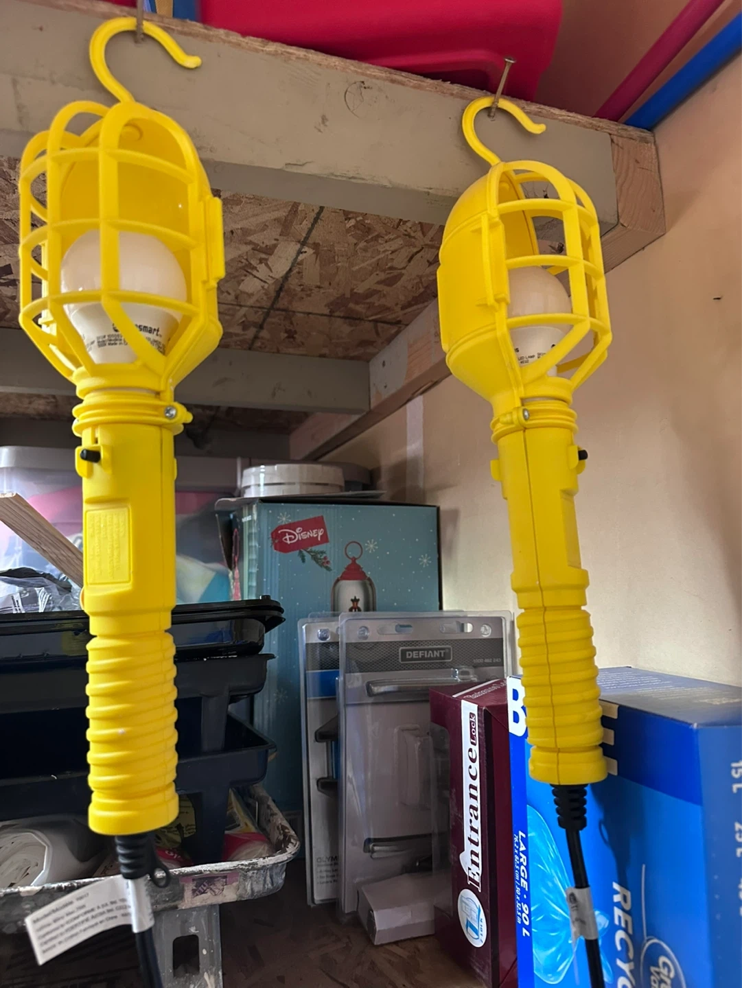 Two yellow work lights with cage protection. Each light has a hook for hanging. Includes bulbs. Great for garages or workshops!