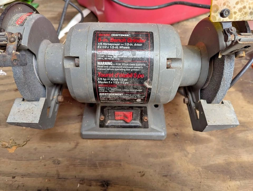 Handy Craftsman 5-inch bench grinder. Has 1/5 horsepower induction motor. Wheels are 5 x 1/2 x 1/2 inch with a 1/2 inch arbor. Runs at 3450 RPM.