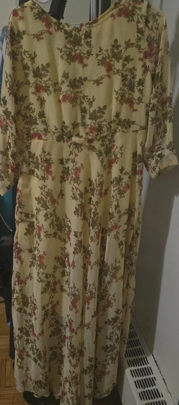 This is a lovely yellow dress with a delicate floral print. It has long sleeves and a flattering fit. The fabric is lightweight and perfect for warmer weather.