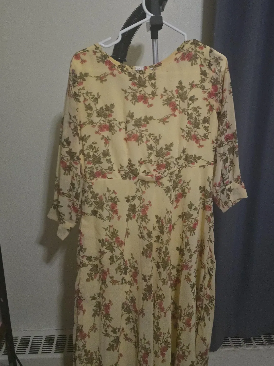 This is a lovely yellow dress with a delicate floral print. It has long sleeves and a flattering fit. The fabric is lightweight and perfect for warmer weather.