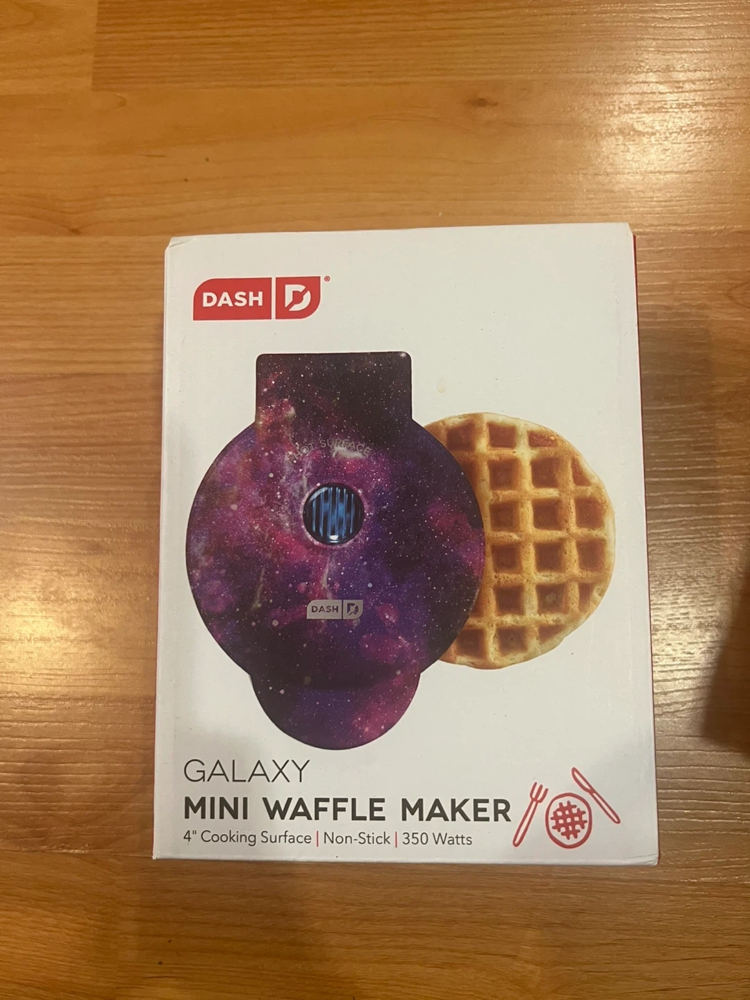 Dash Galaxy Mini Waffle Maker. It's a 4-inch cooking surface with non-stick coating. This appliance uses 350 Watts.