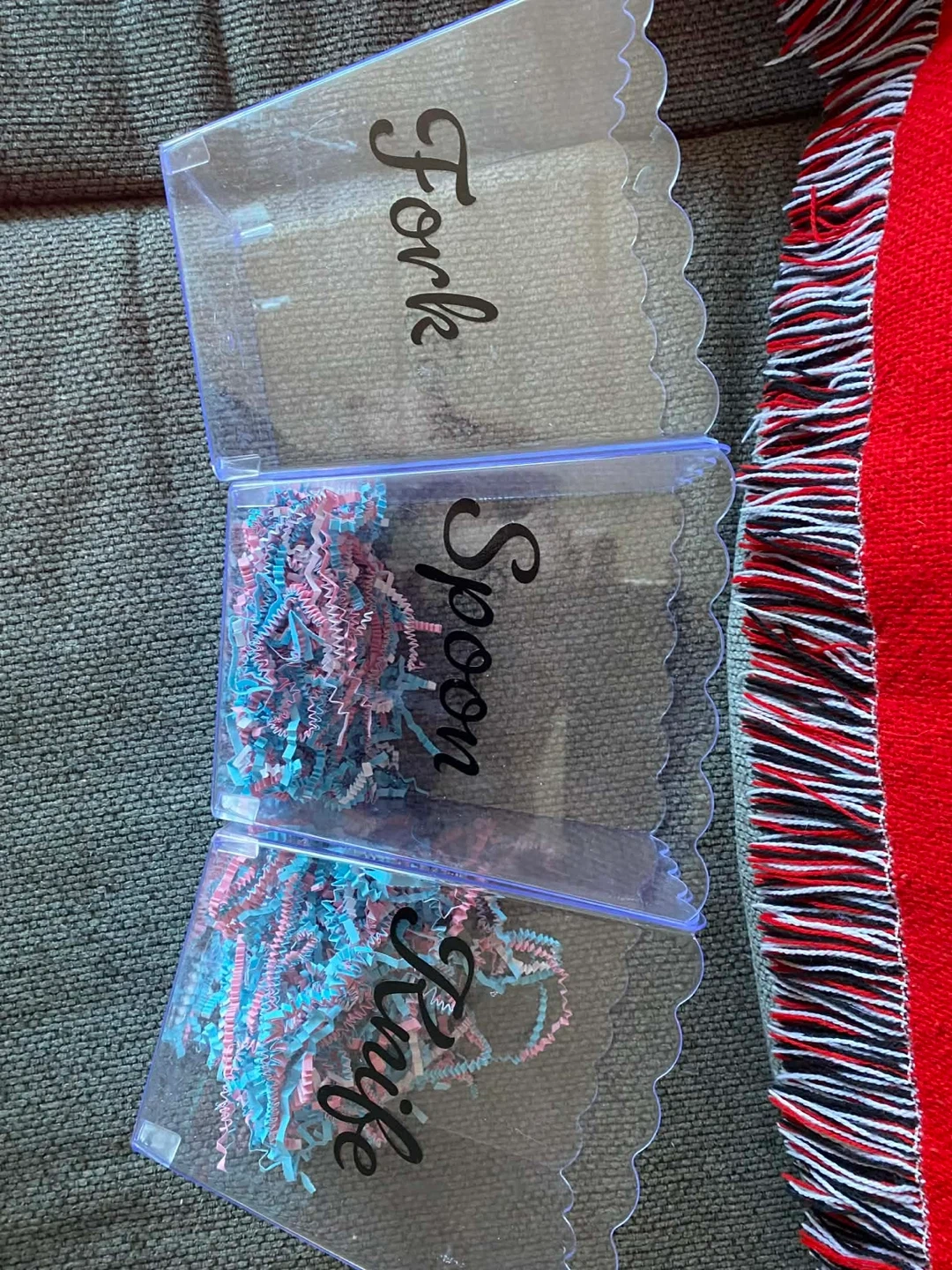 Clear plastic organizer box for cutlery. It's divided into three sections labeled Fork, Spoon, and Knife. Includes shredded paper filler.
