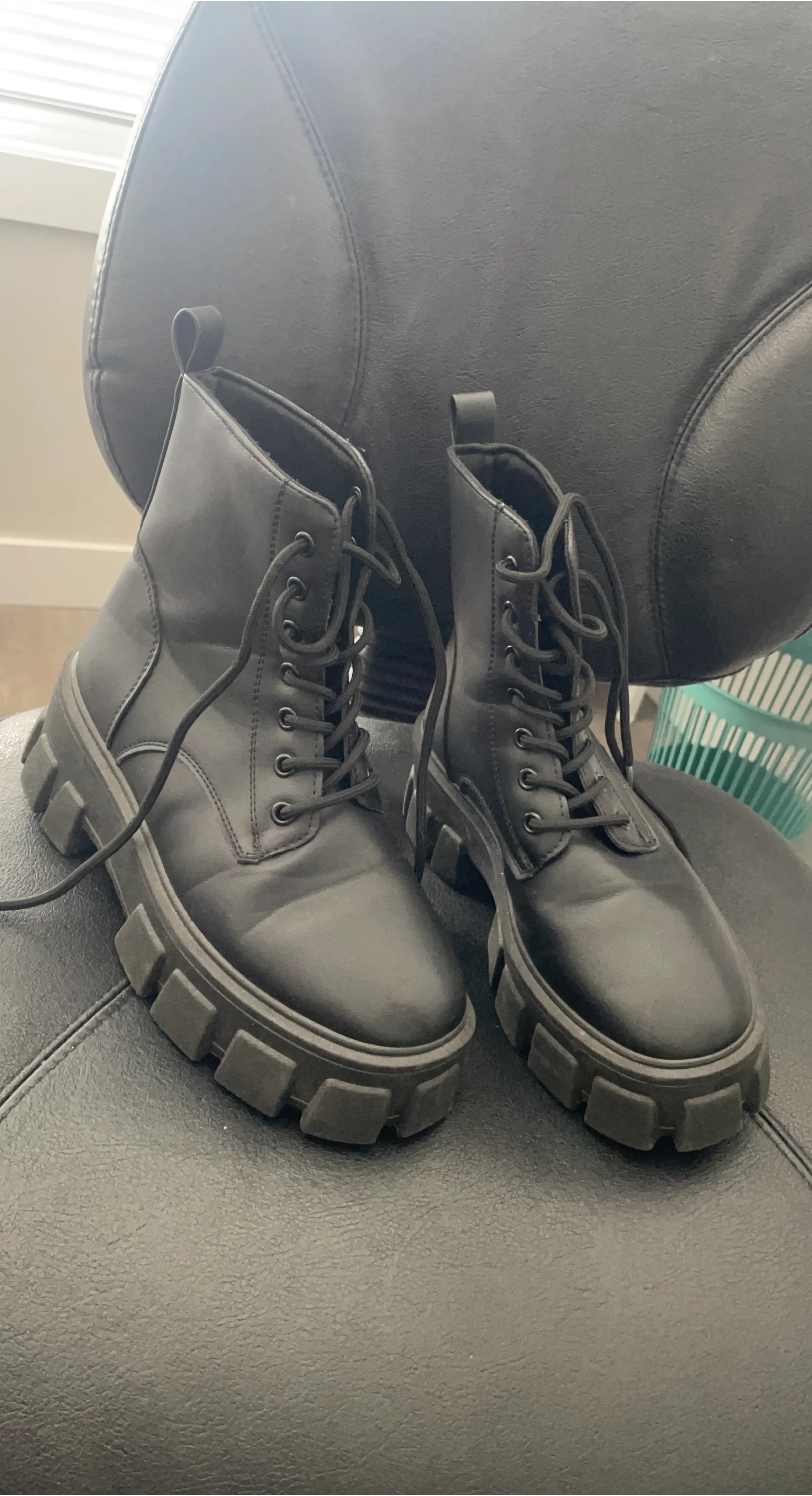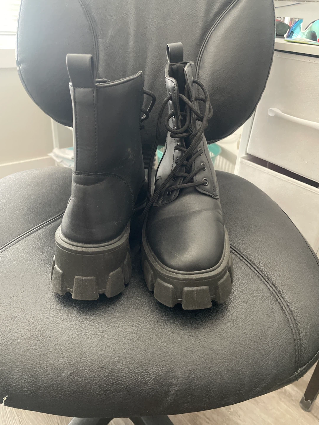 These black lace-up boots feature a bold chunky platform sole. Made with a synthetic material, they offer a stylish and durable option. Easy to pair with many outfits!
