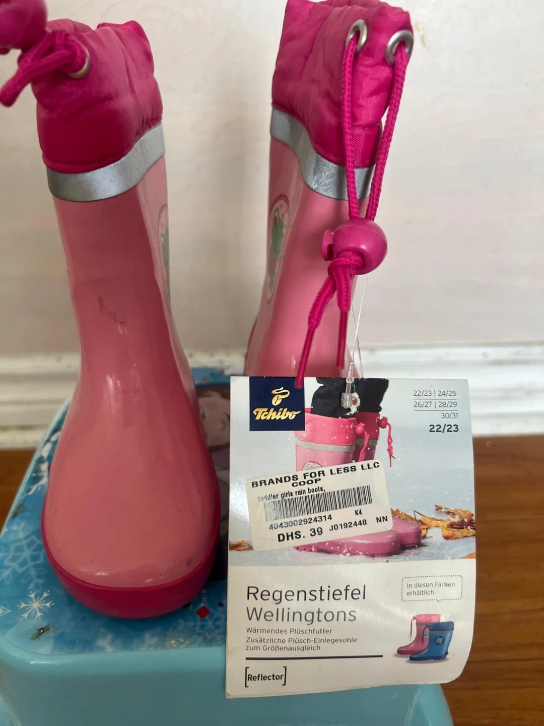 10These adorable Tchibo rain boots are perfect for your little one! They're a lovely shade of pink and feature a cute frog design. The size is 22/23. These boots have reflectors for added safety and a warm plush lining to keep little feet cozy on rainy days