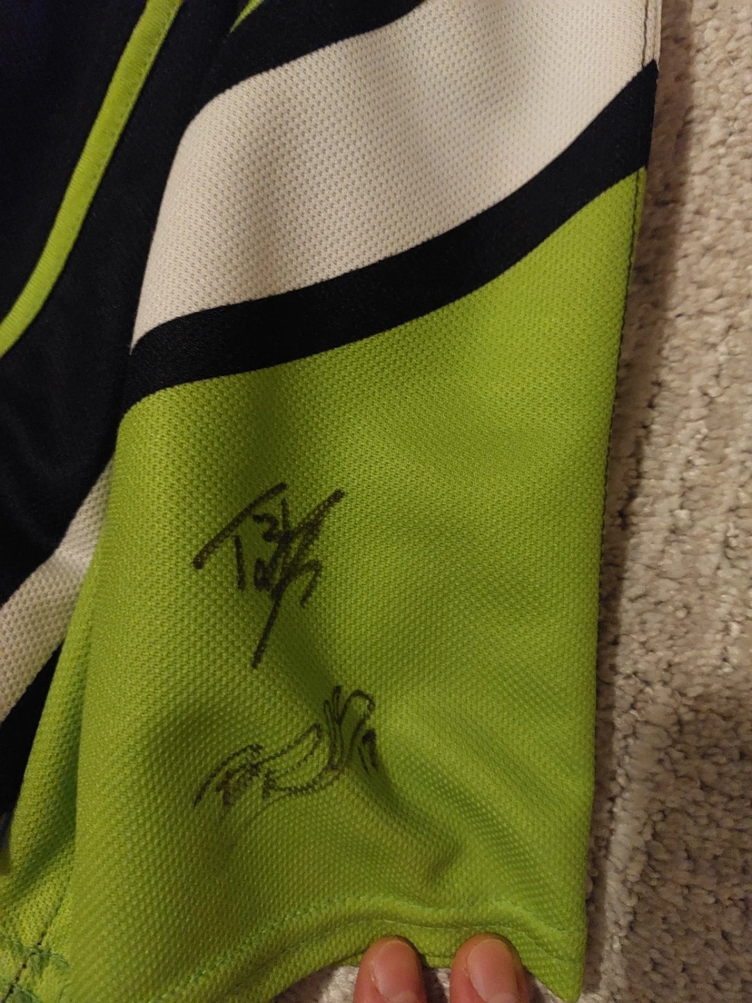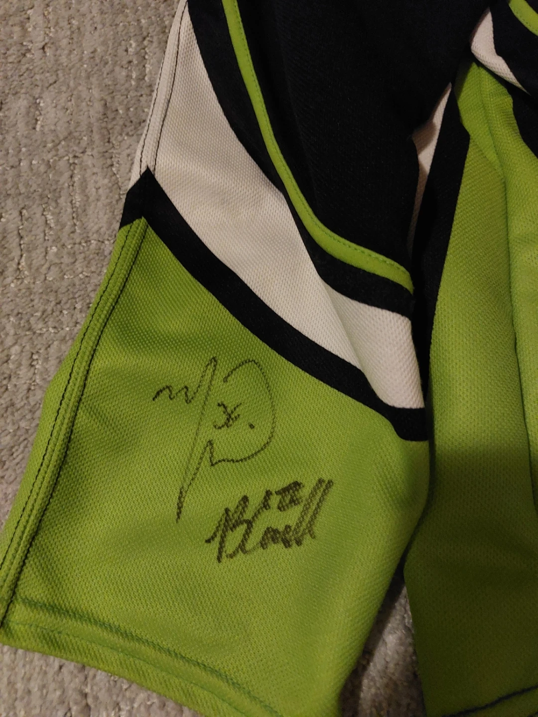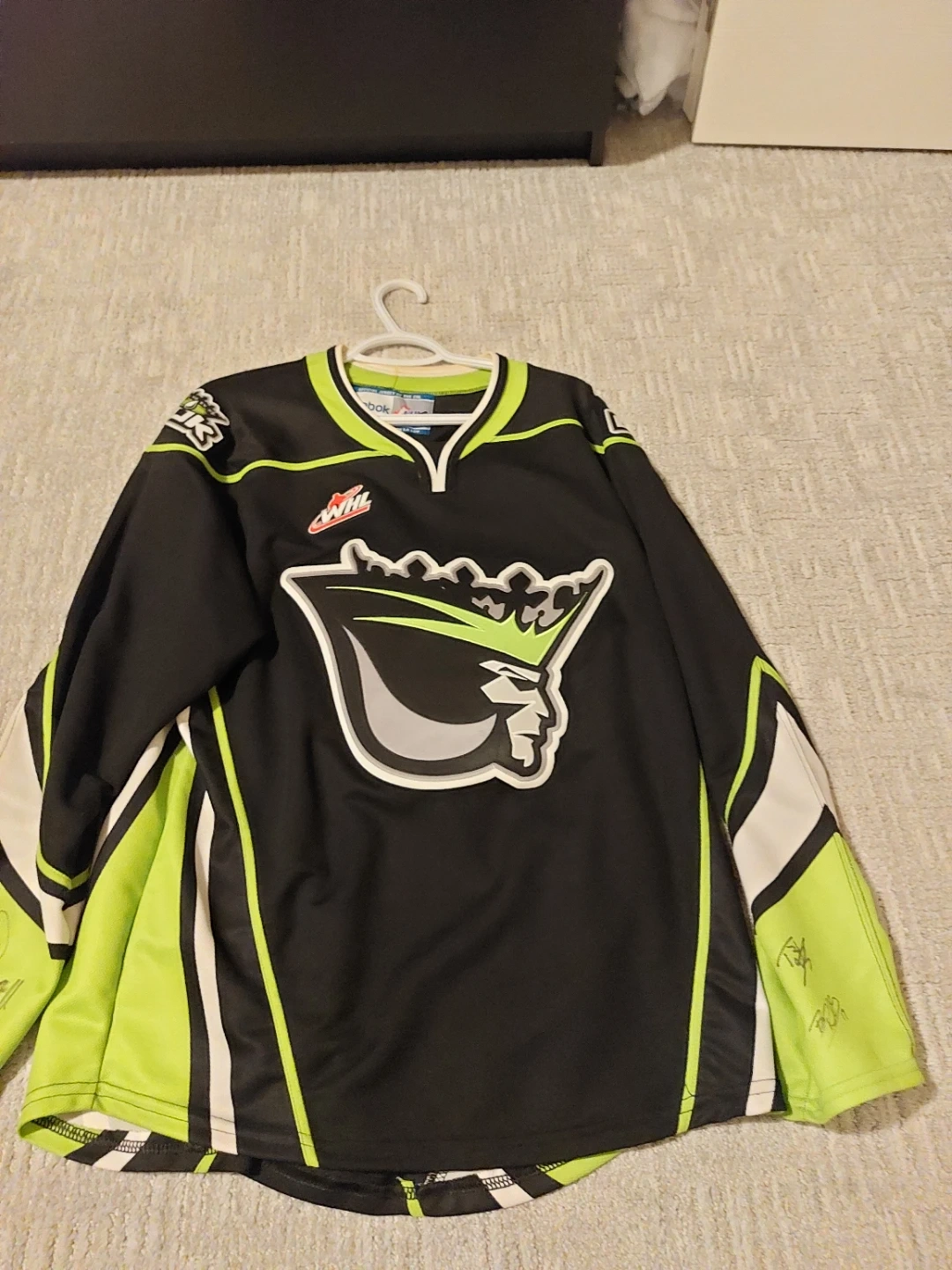 Reebok CHL hockey jersey in size medium. It's black with green and white accents. This jersey features signatures on the sleeves! Signed by the memorial cup winning team