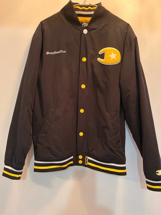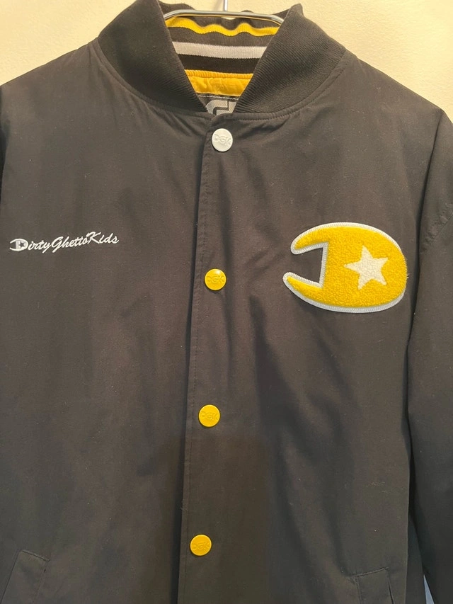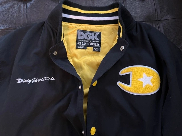 DGK Varsity Bomber Jacket, Size Large. Black and Yellow 'Dirty Ghetto Kids' Brand. Vintage, NEW condition. Located near McCowan and Sheppard in Scarborough. Cash accepted.