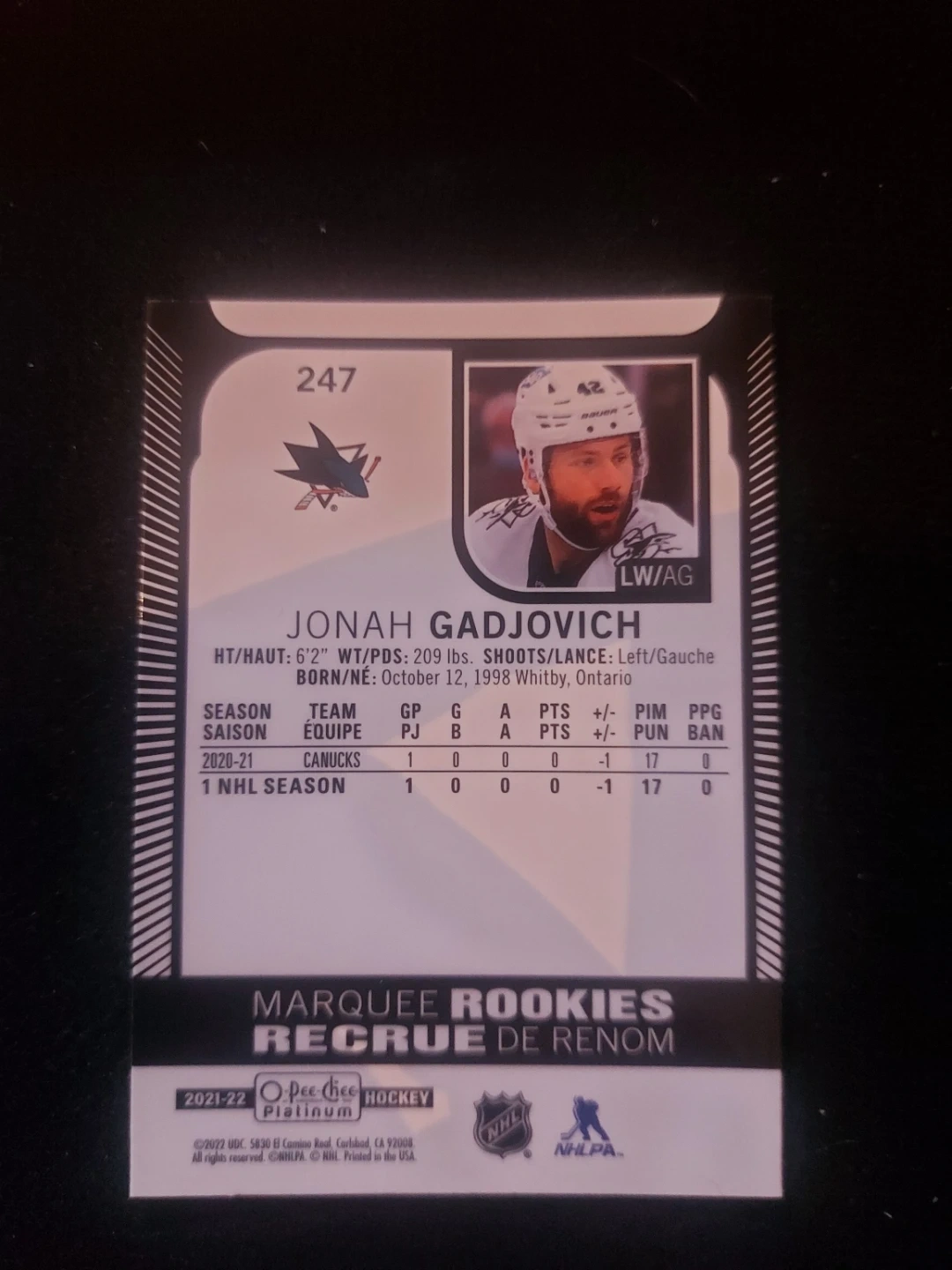 This is a 2021-22 O-Pee-Chee Platinum hockey card featuring rookie Jonah Gadjovich. It's card number 247. Printed in the USA.